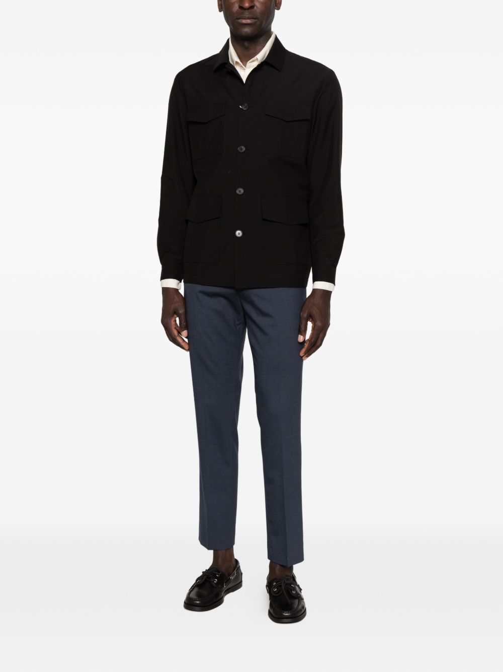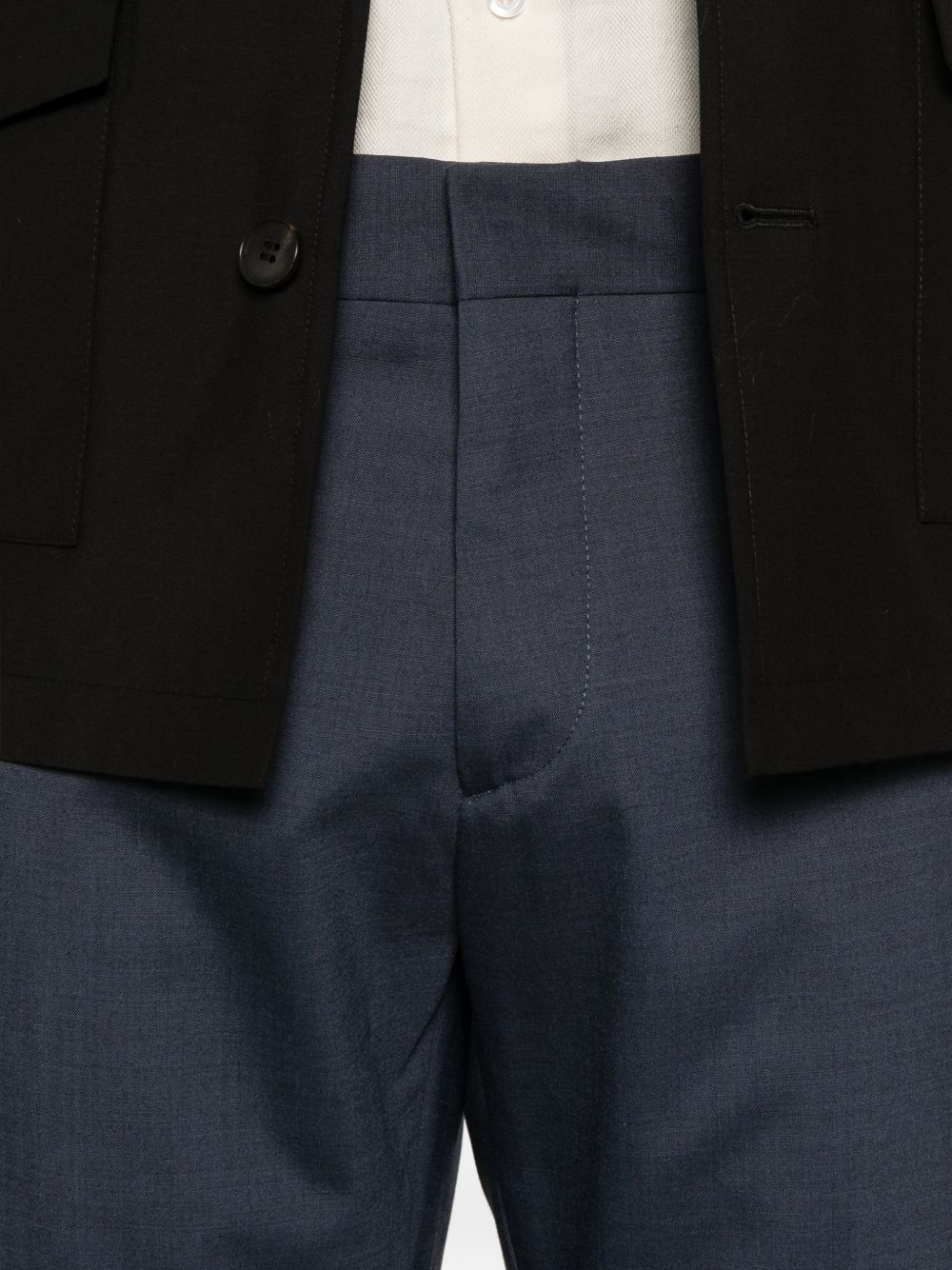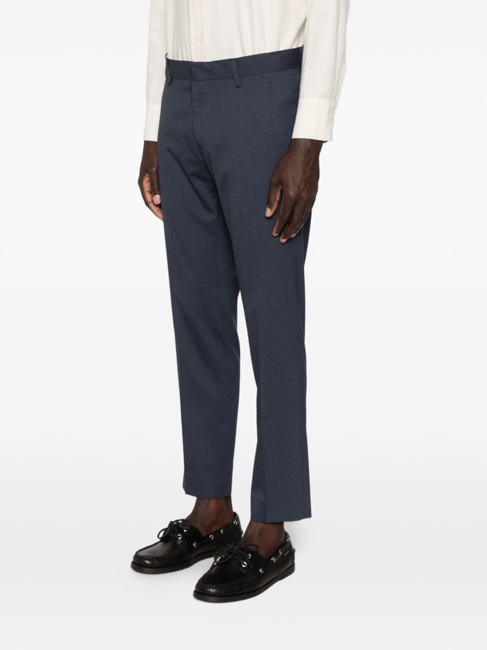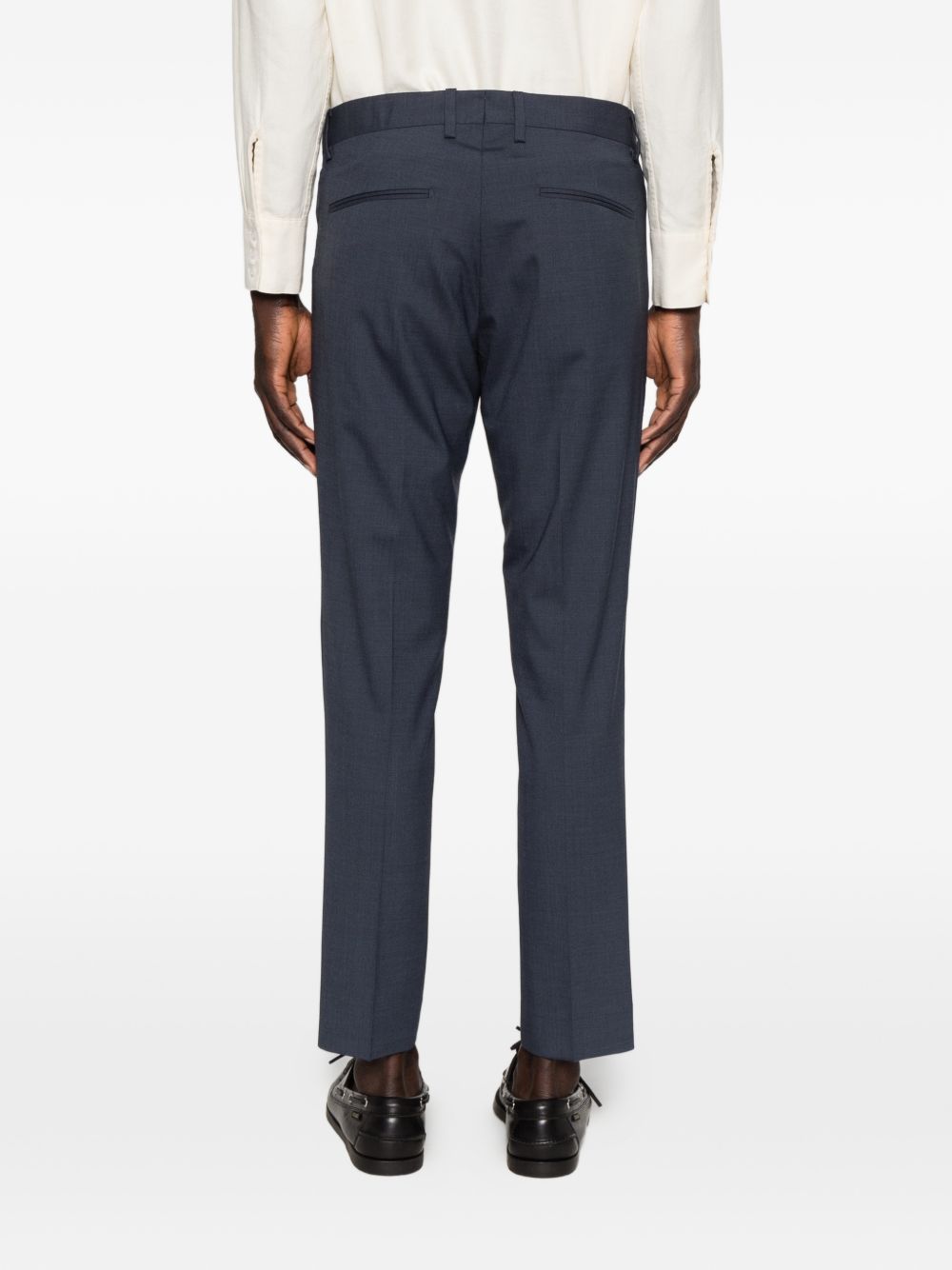 Pantalone in tela lana cotone, passanti per cintura, modello slim, chiusura frontale nascosta, due tasche laterali a filetto, due tasche posteriori a filetto, piega stirata