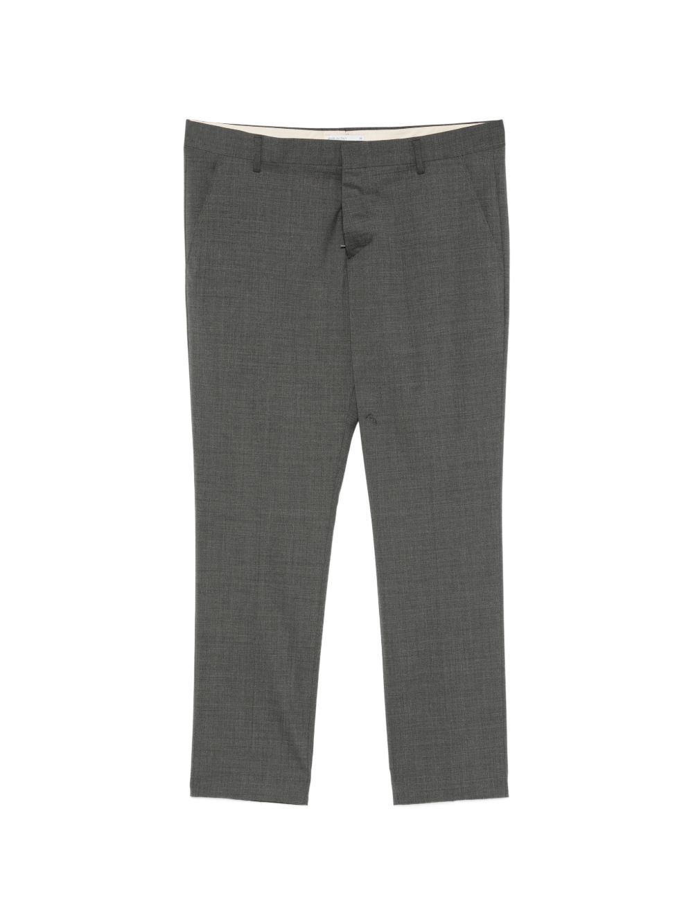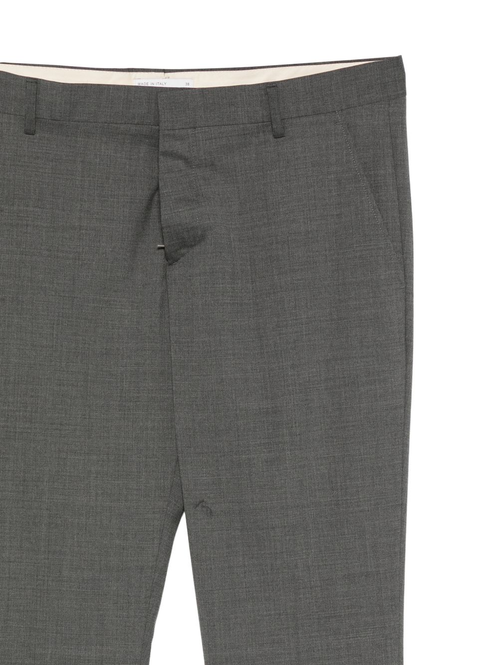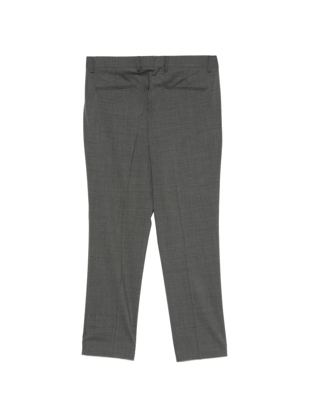 Pantalone in tela lana cotone, passanti per cintura, modello slim, chiusura frontale nascosta, due tasche laterali a filetto, due tasche posteriori a filetto, piega stirata