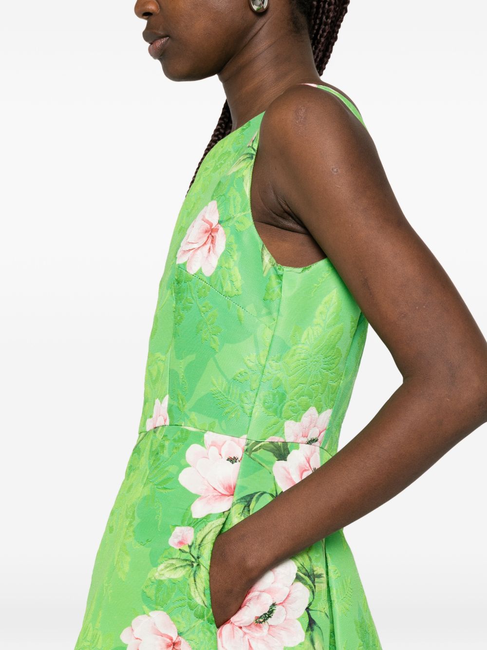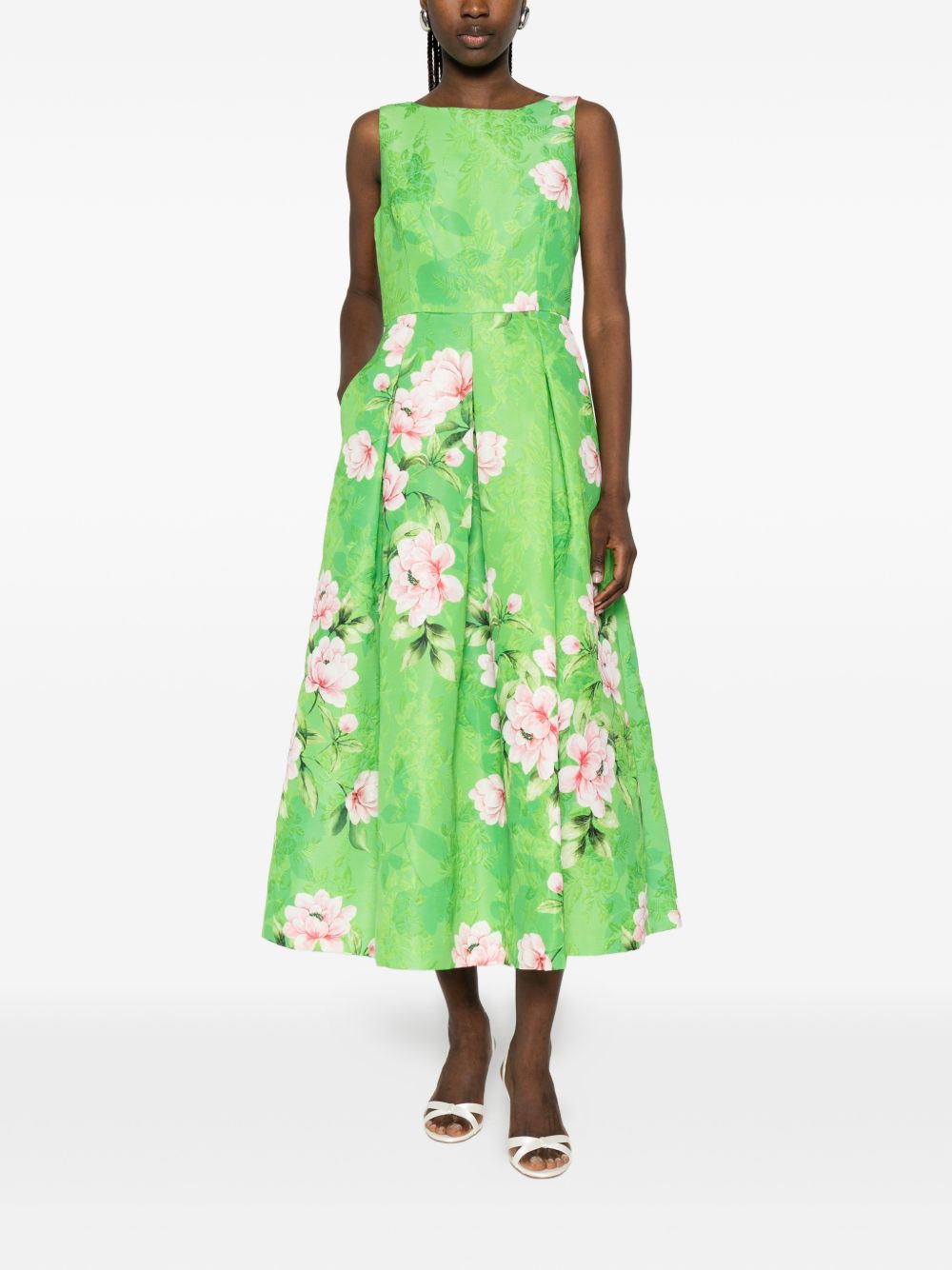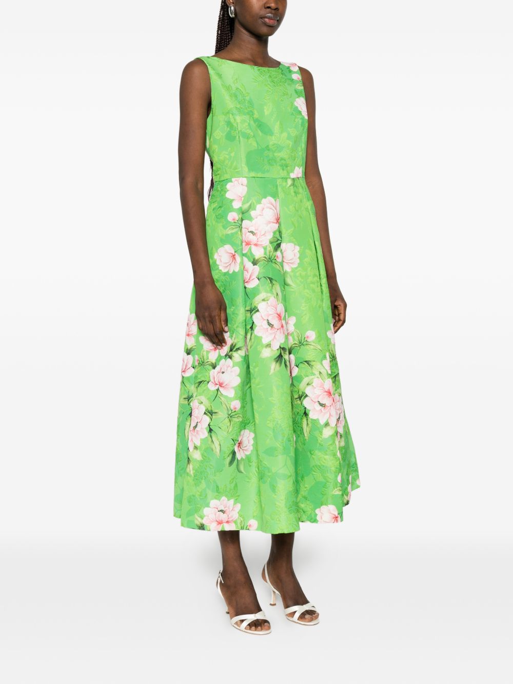 Abito verde chiaro a fiori broccato in cotone, giro maniche, girocollo, punto vita segnato