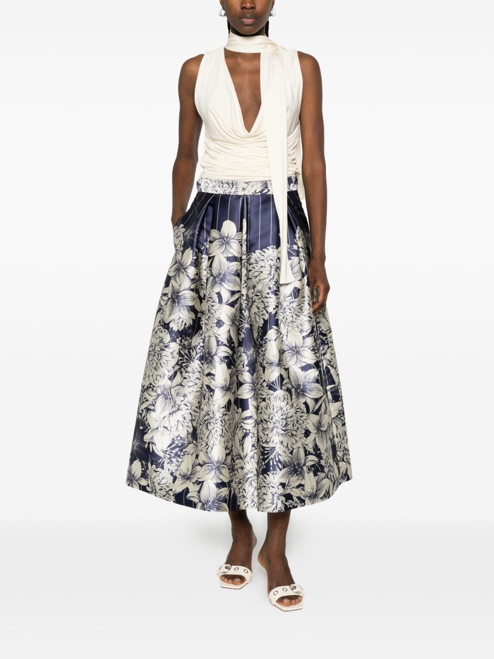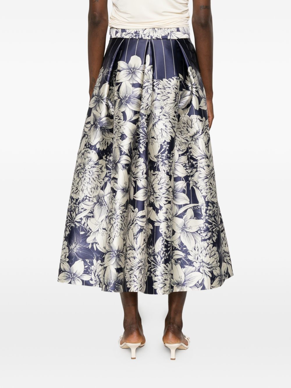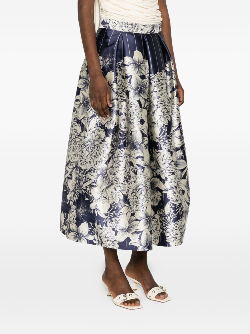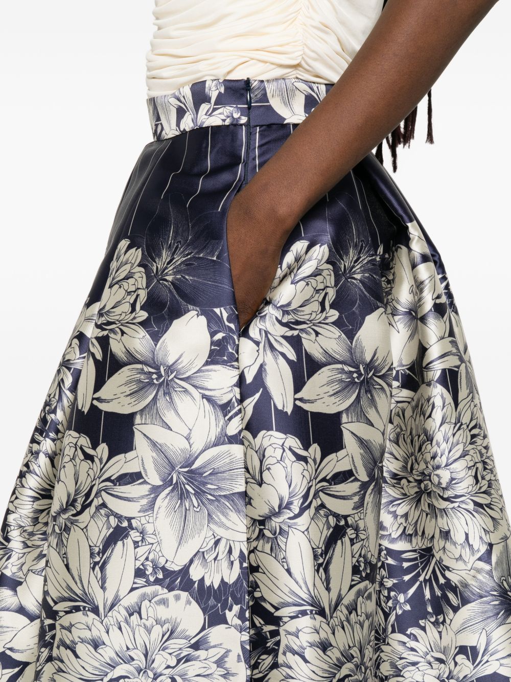 Gonna in raso blu a campana, stampa floreale, chiusura con zip, bustino