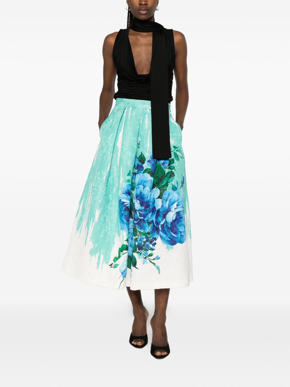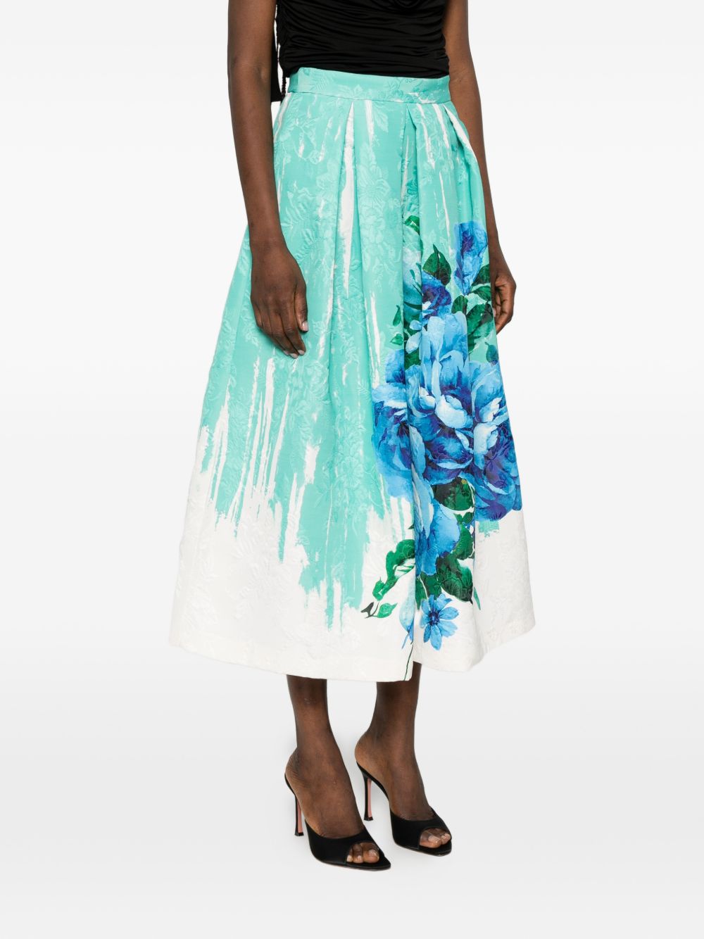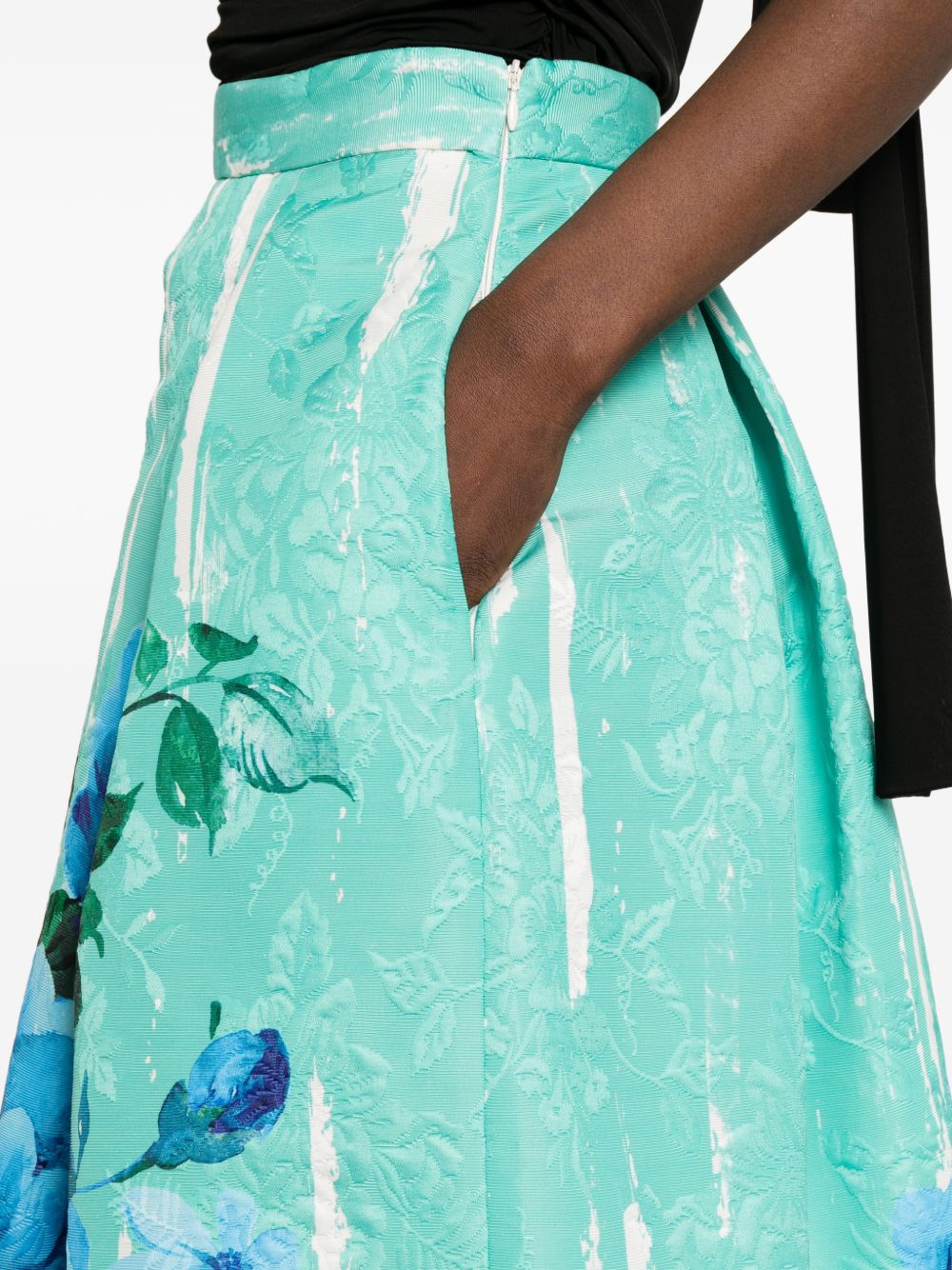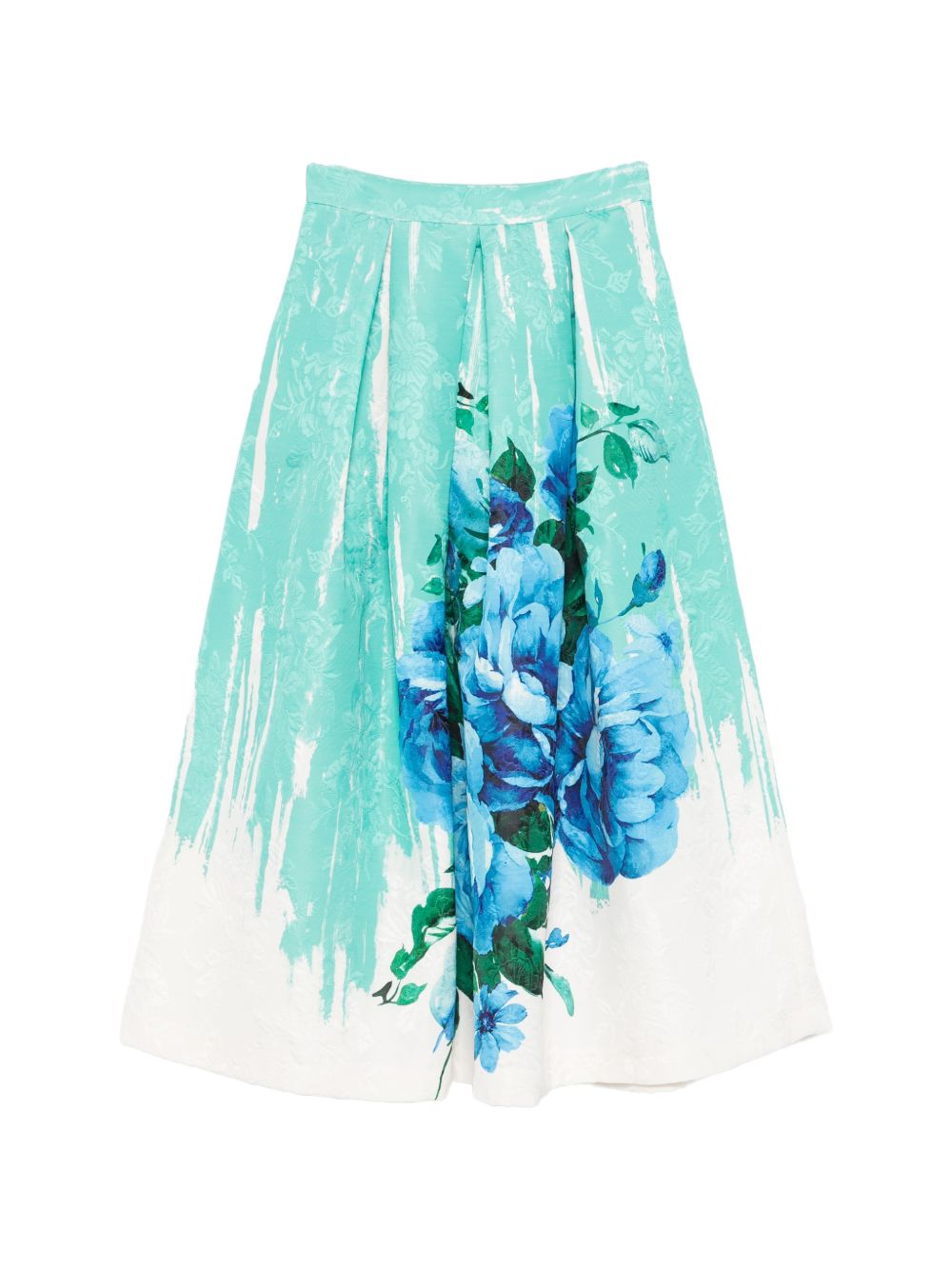 Gonna in poliestere broccato azzurro a campana, stampa floreale, chiusura con zip