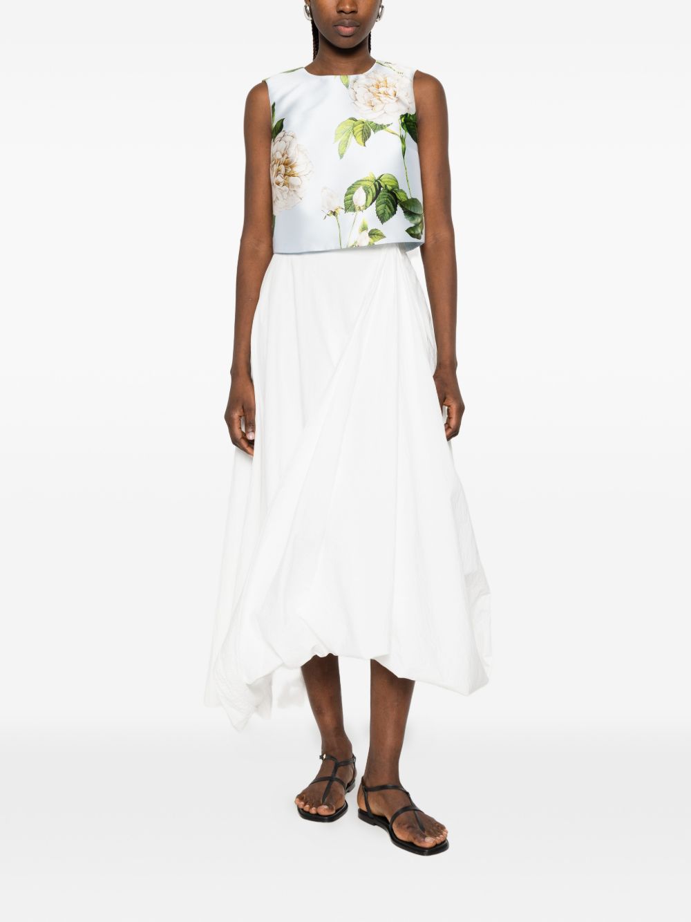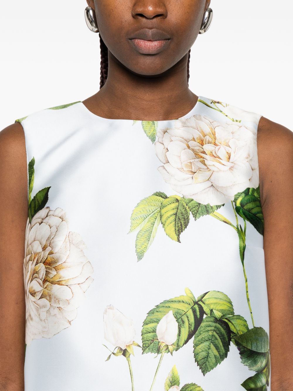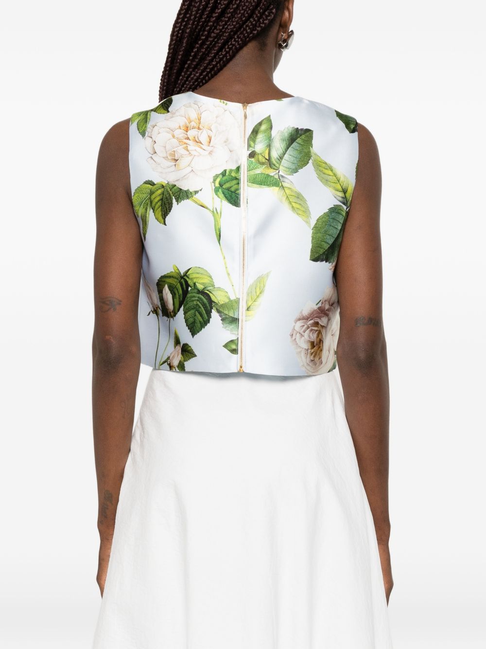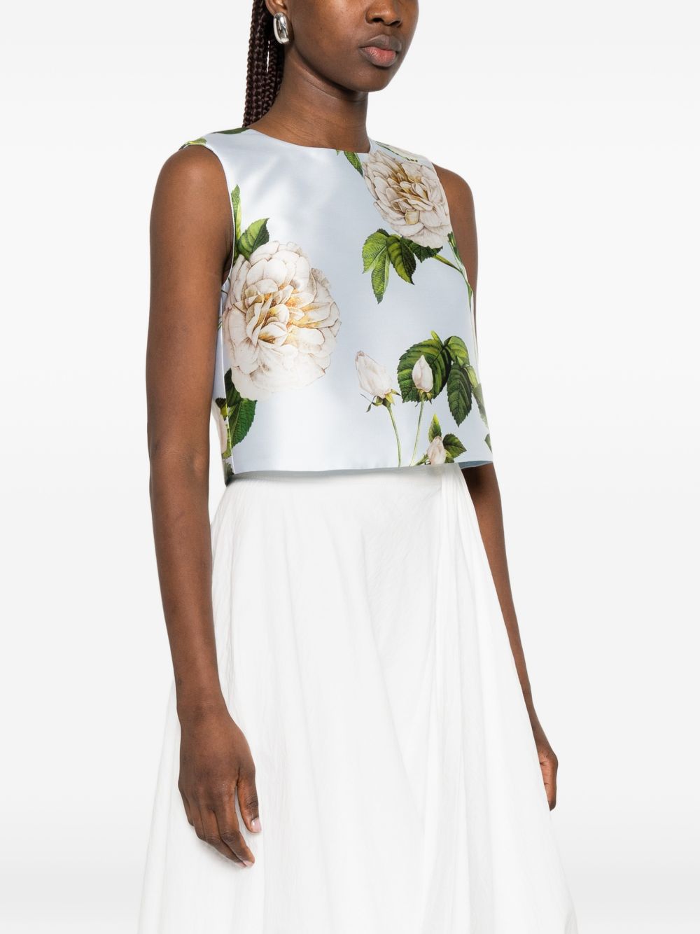 Top in raso azzurro, girocollo, giro maniche, stampa fiori