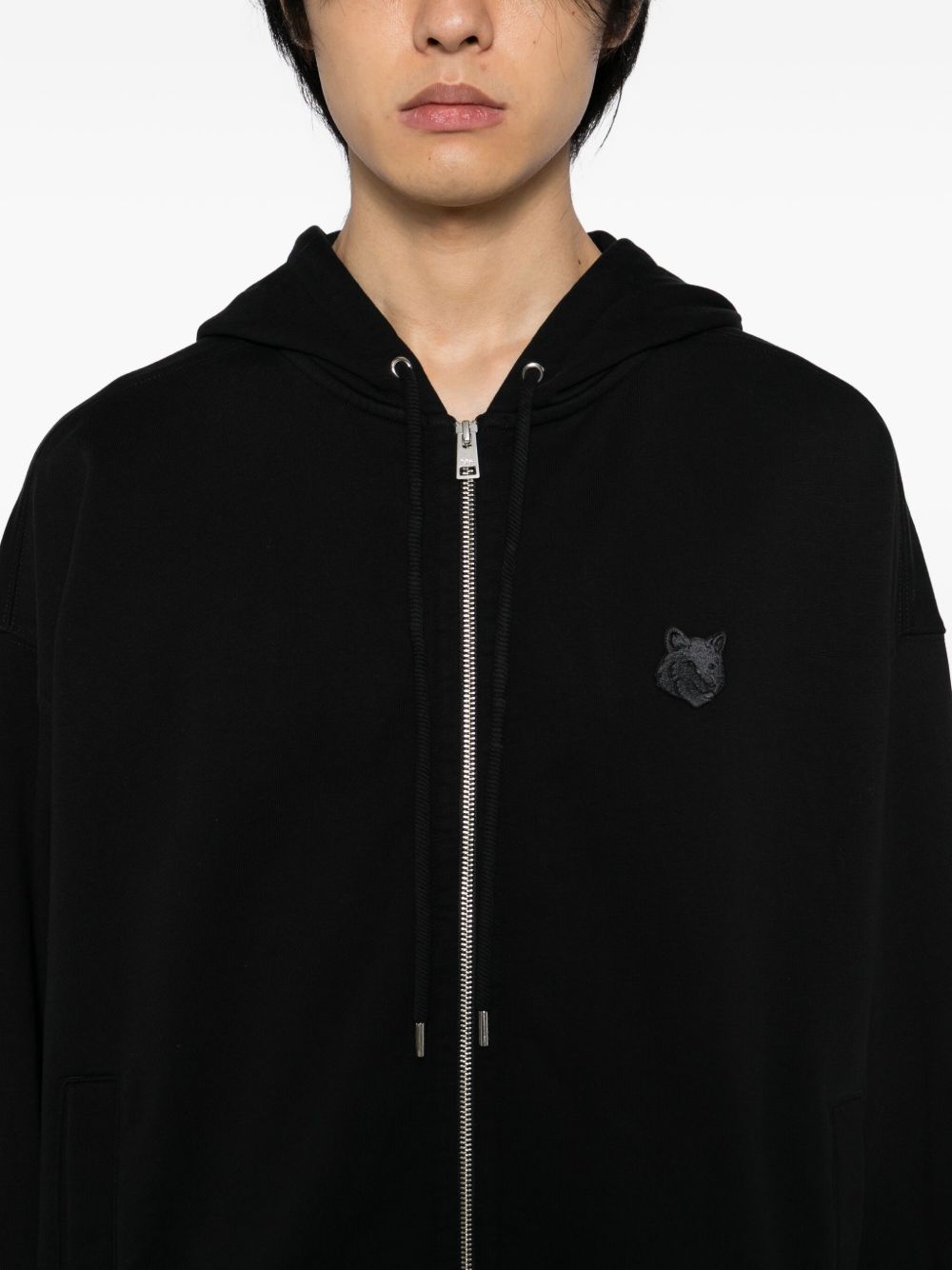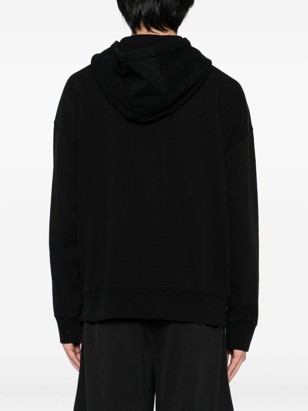 Felpa con zip in cotone nero, cappuccio regolabile, applicazione logo sul petto
