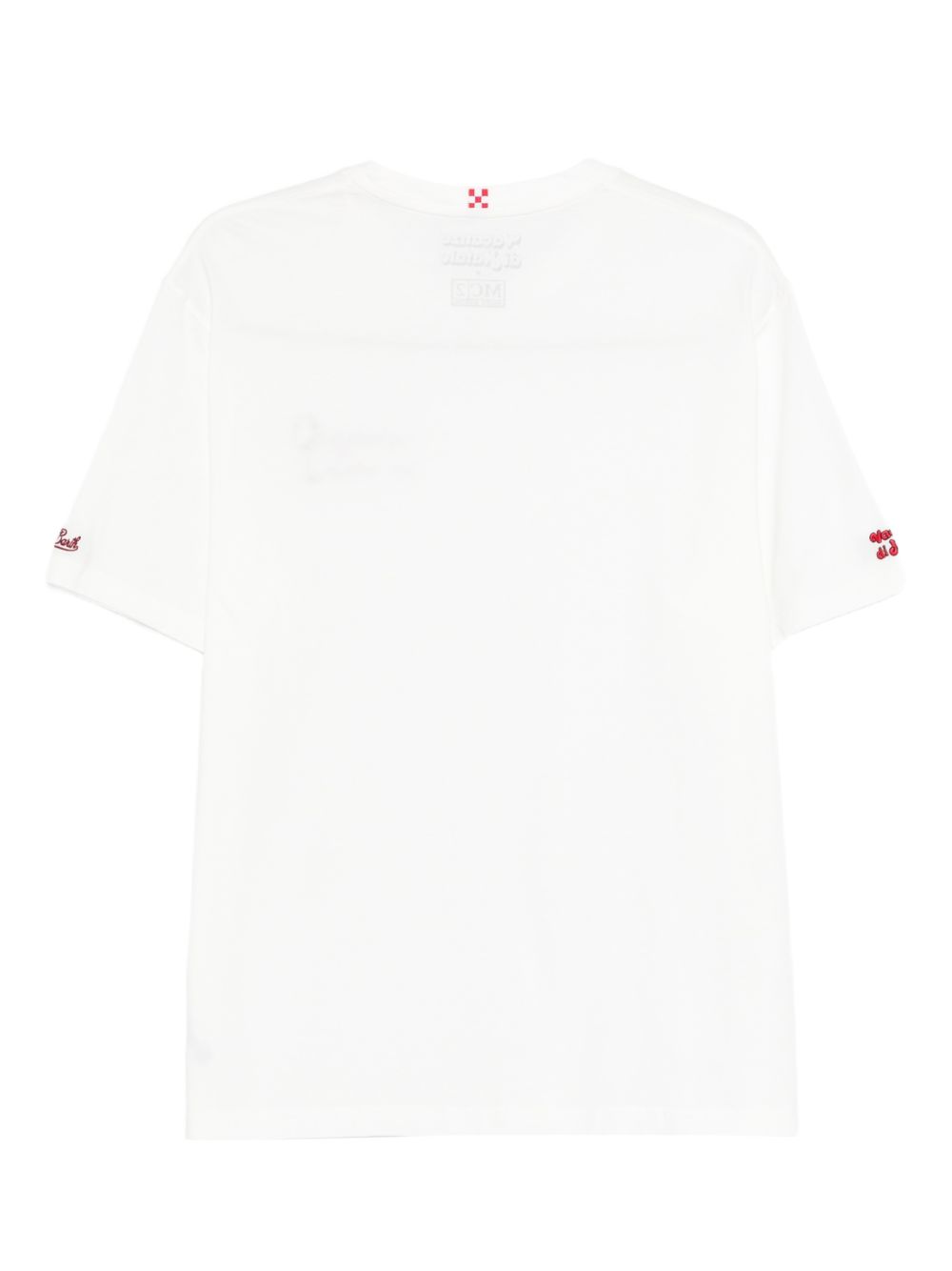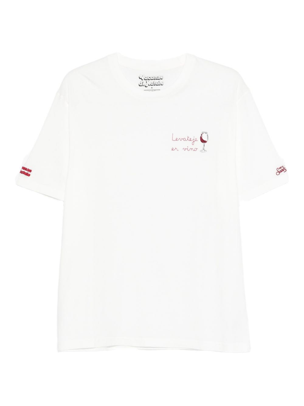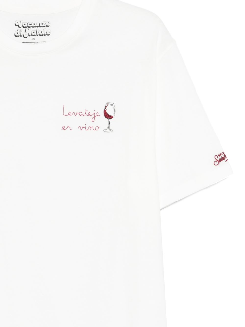 T-shirt in cotone bianca con ricamo sul petto "Levategli il vino"