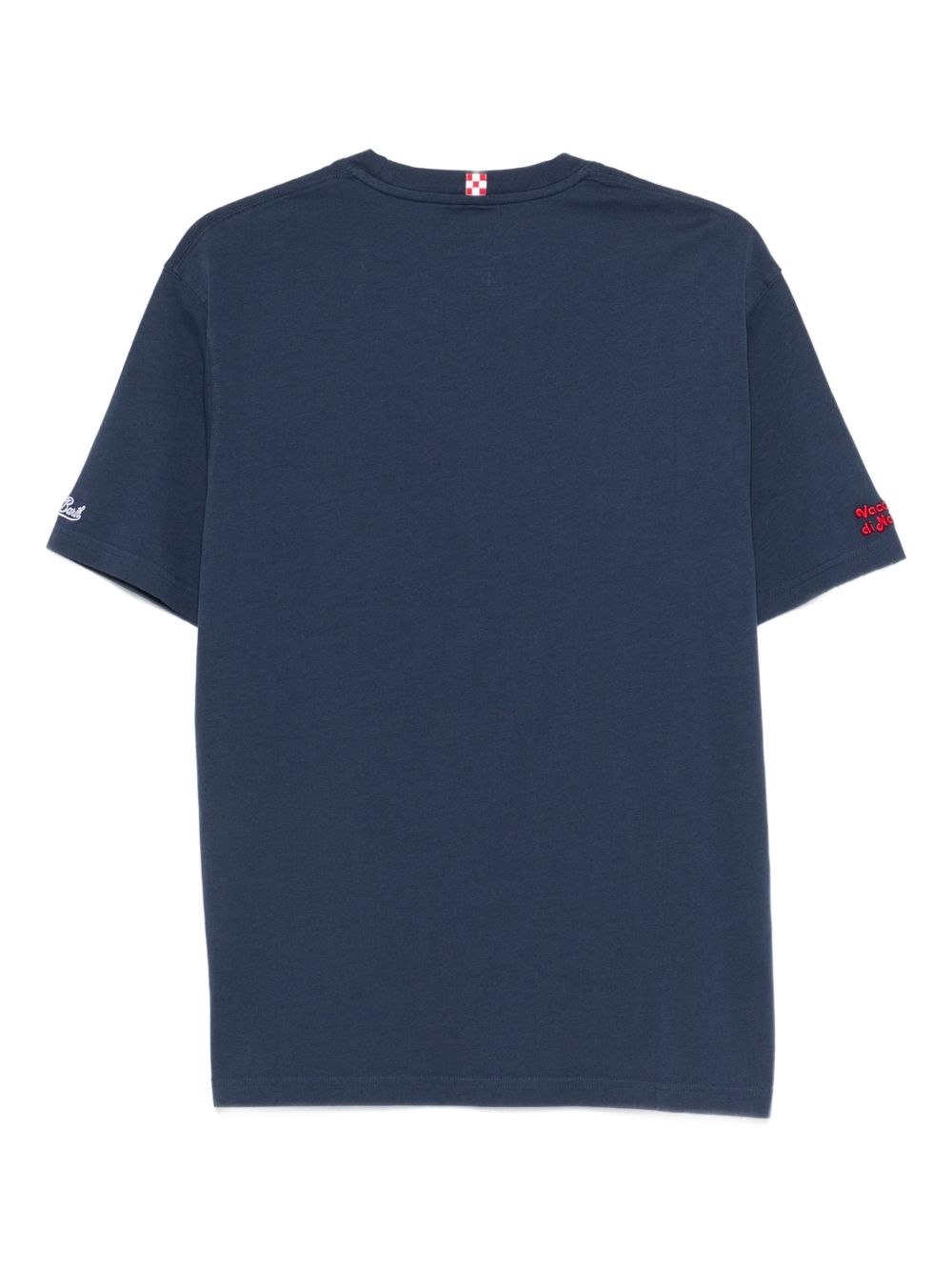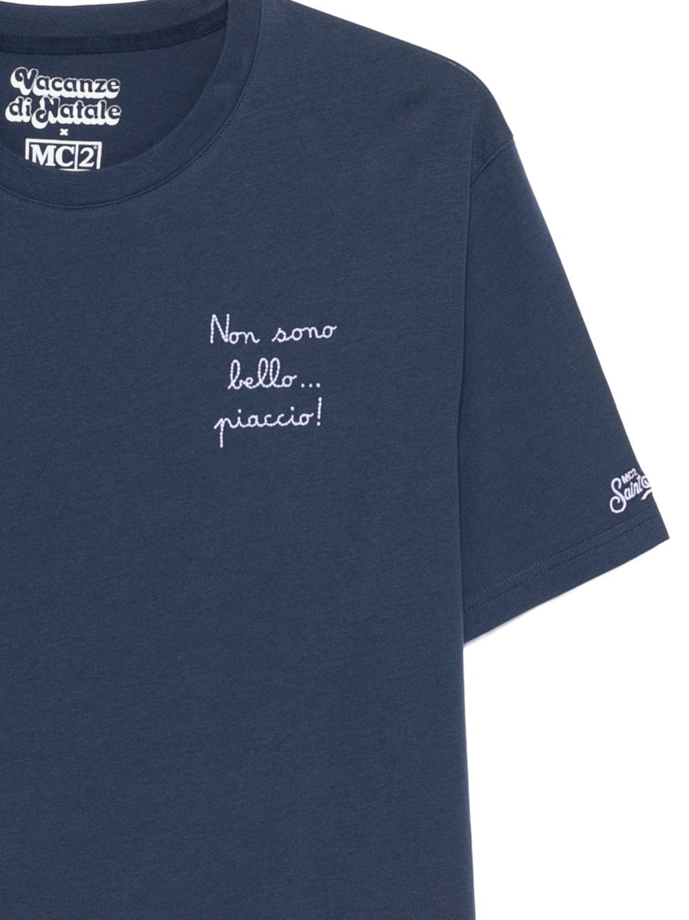 T-shirt in cotone blu con ricamo sul petto "Non sono bello... piaccio!"