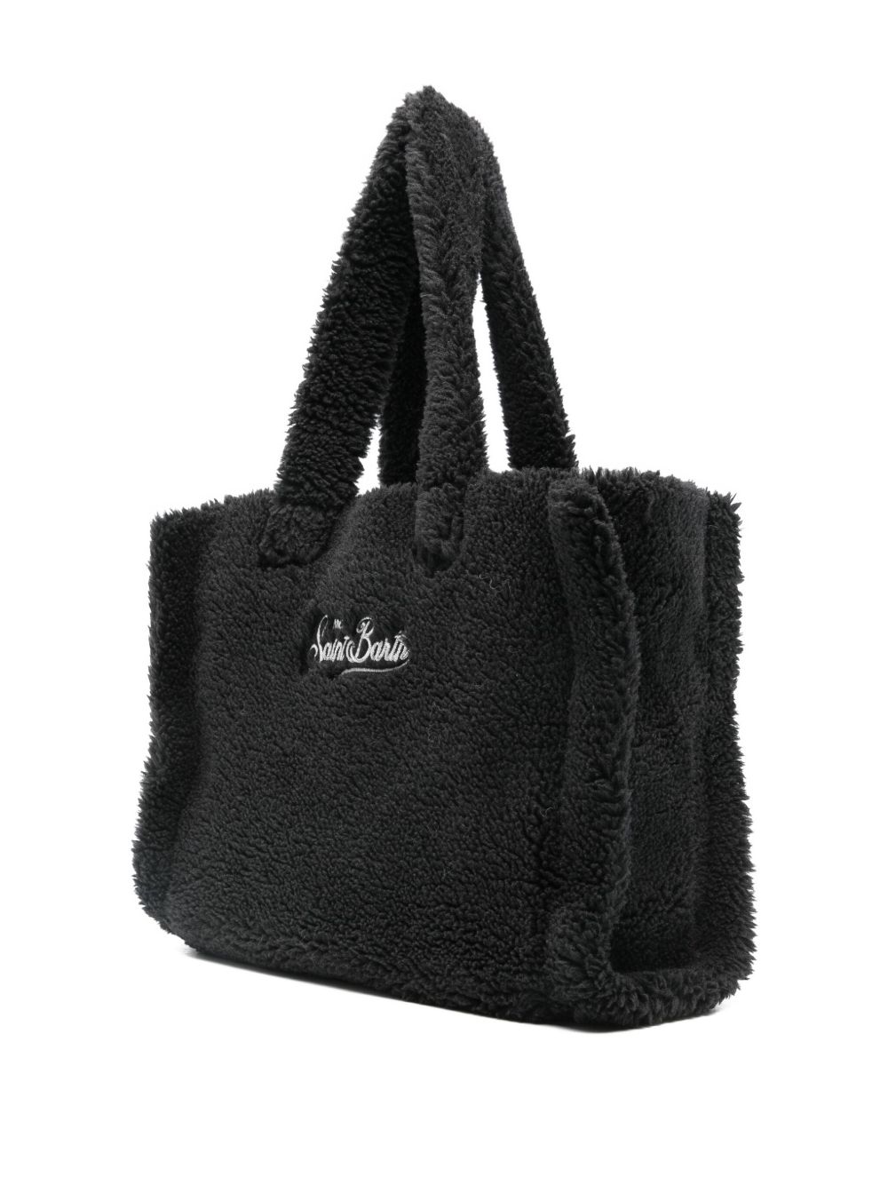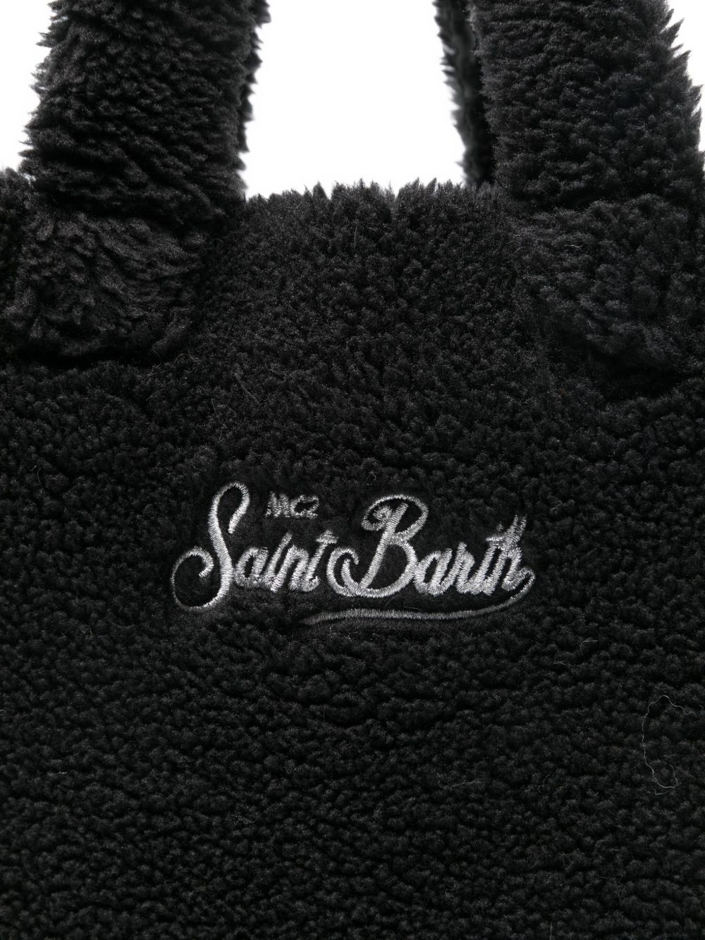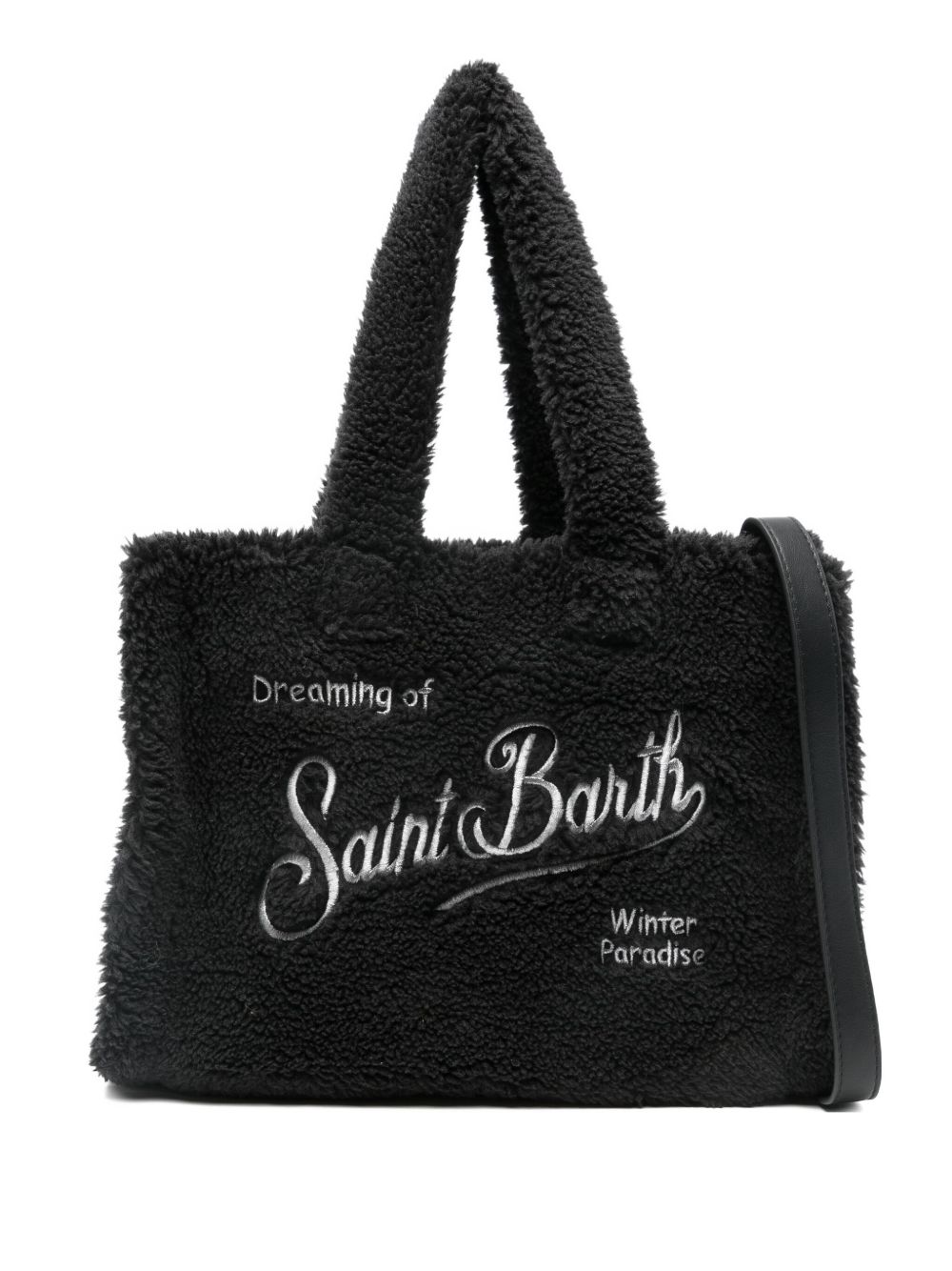 Borsa nera in eco-pellicia con ricamo, due manici superiori, tracolla removibile