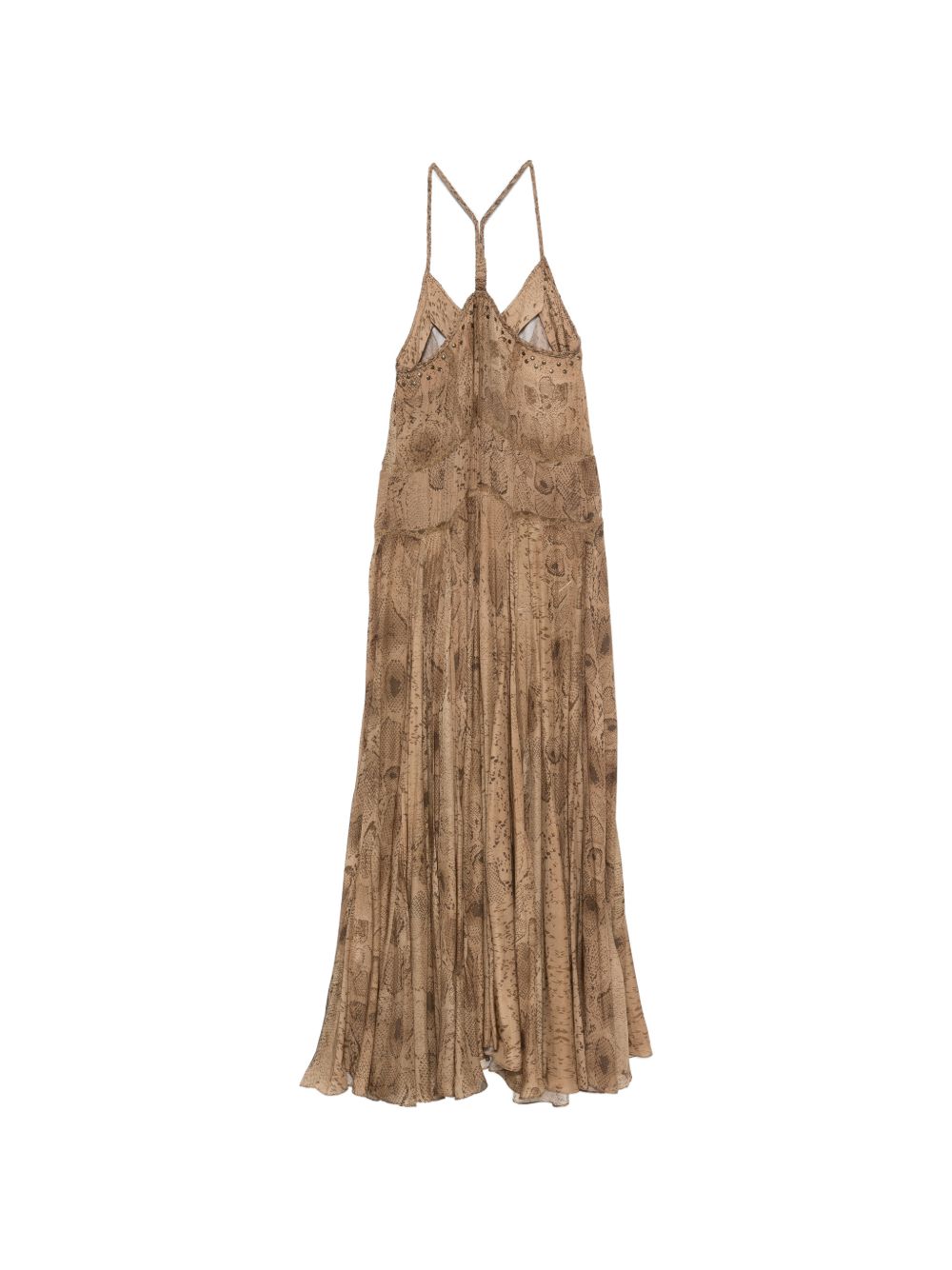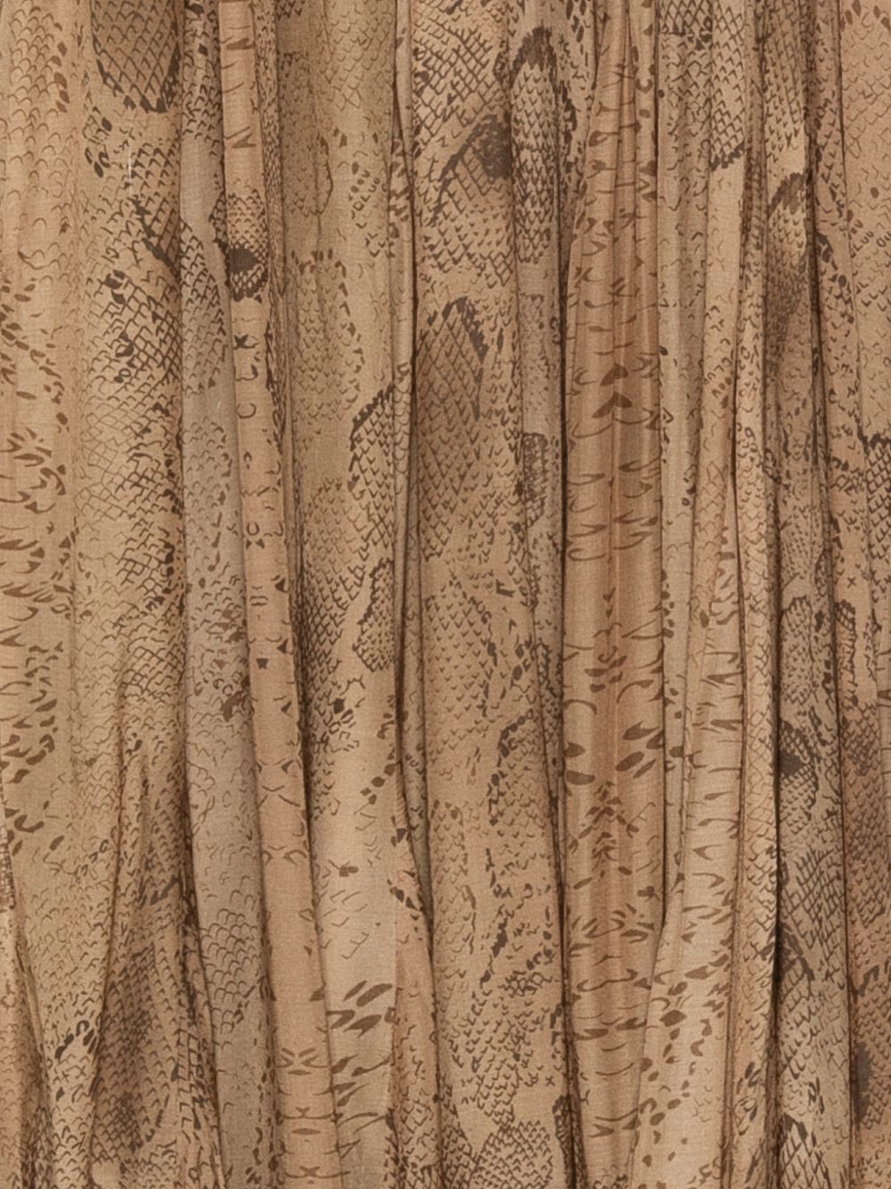 Abito lungo in viscosa stampata beige, stampa serpente, svasato, spalle scoperte, scollo americana