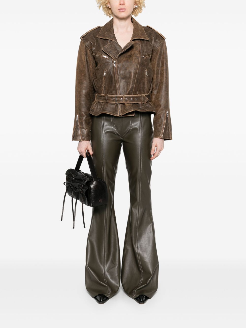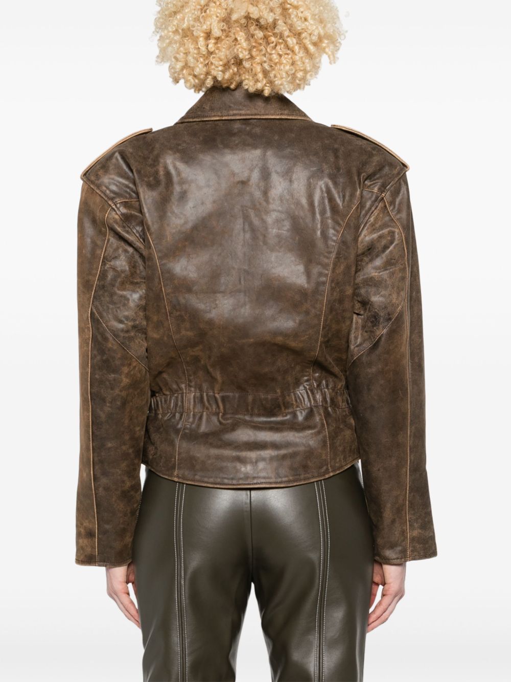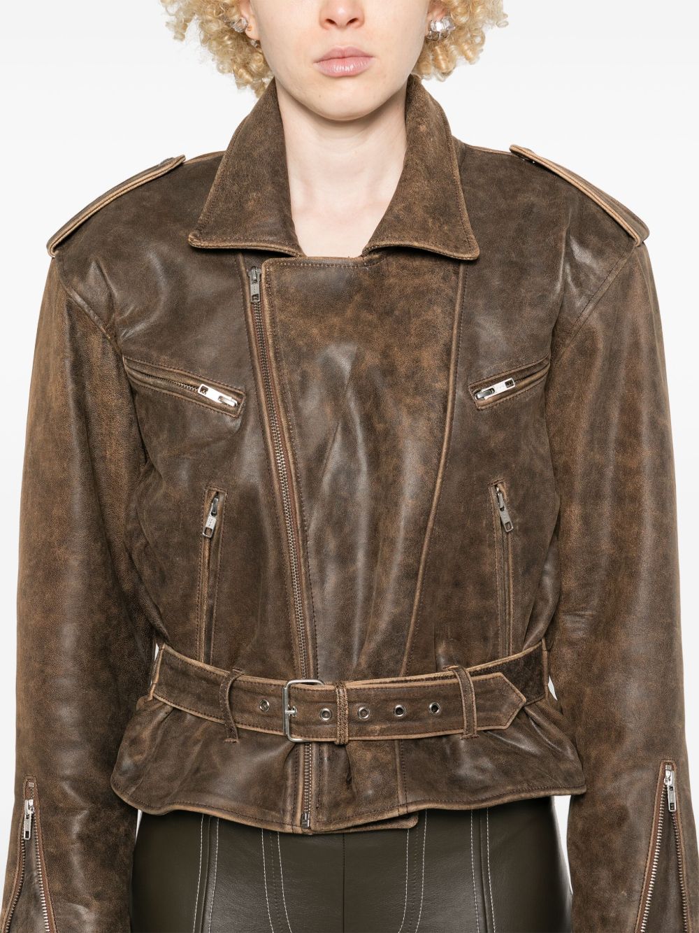 Giubbino corto modello biker marrone in pelle, imbottito, zip davanti con cintura