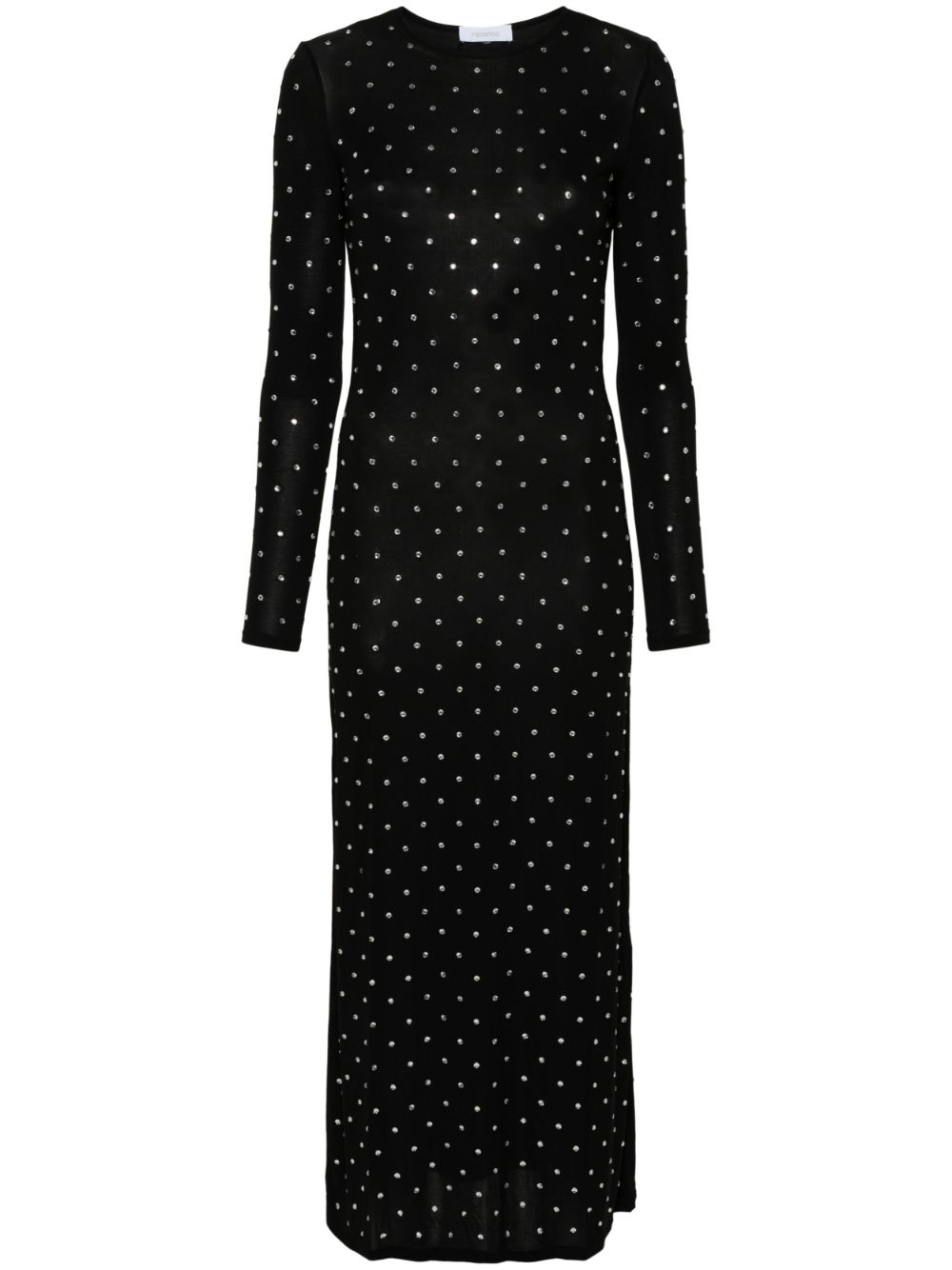 Abito lungo in jersey elasticizzato nero impreziosito da cristalli con placca logo argentata sul retro, scollo rotondo, maniche lunghe, fondo dritto