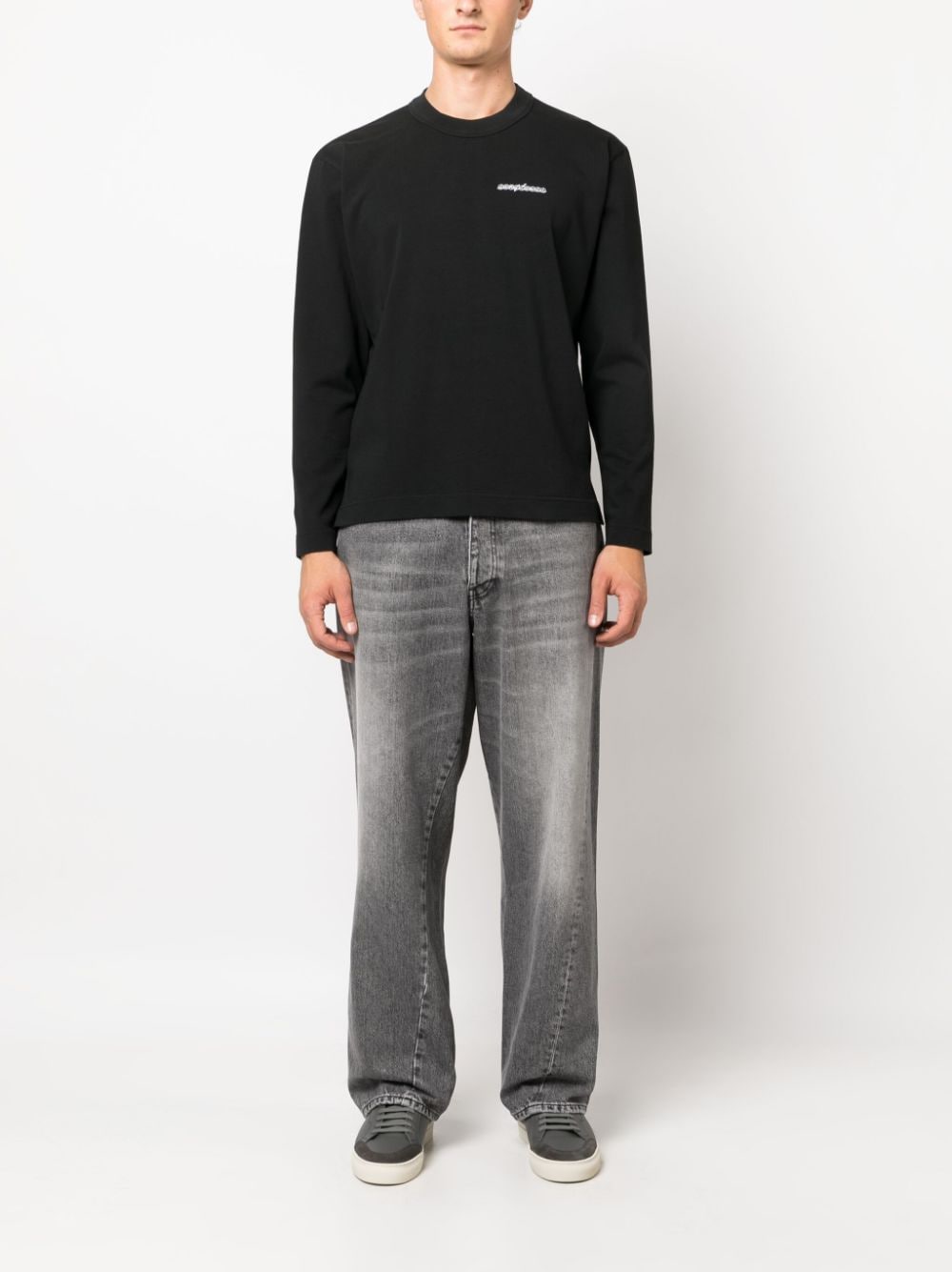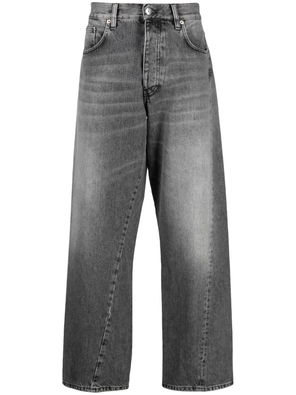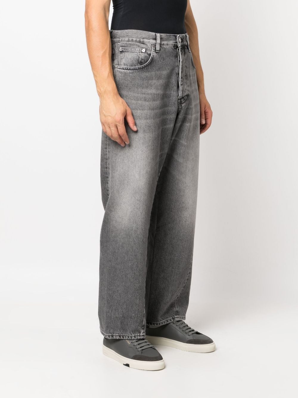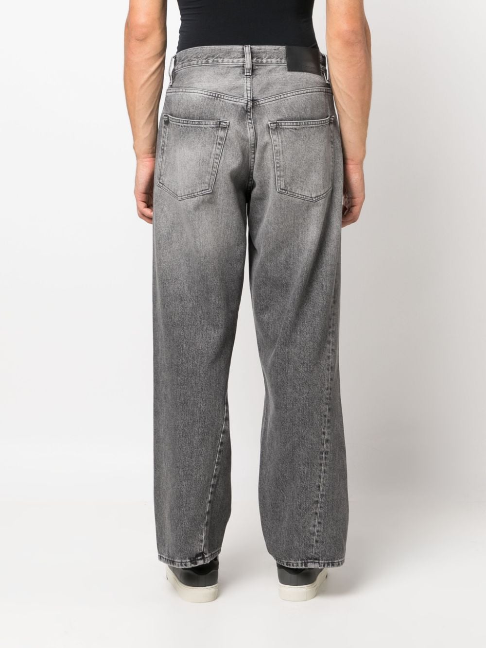 Jeans denim grigio medio. Lavaggio chiaro con logo applicato sul retro, passanti per cintura, gamba dritta, chiusura con bottoni, cinque tasche classiche