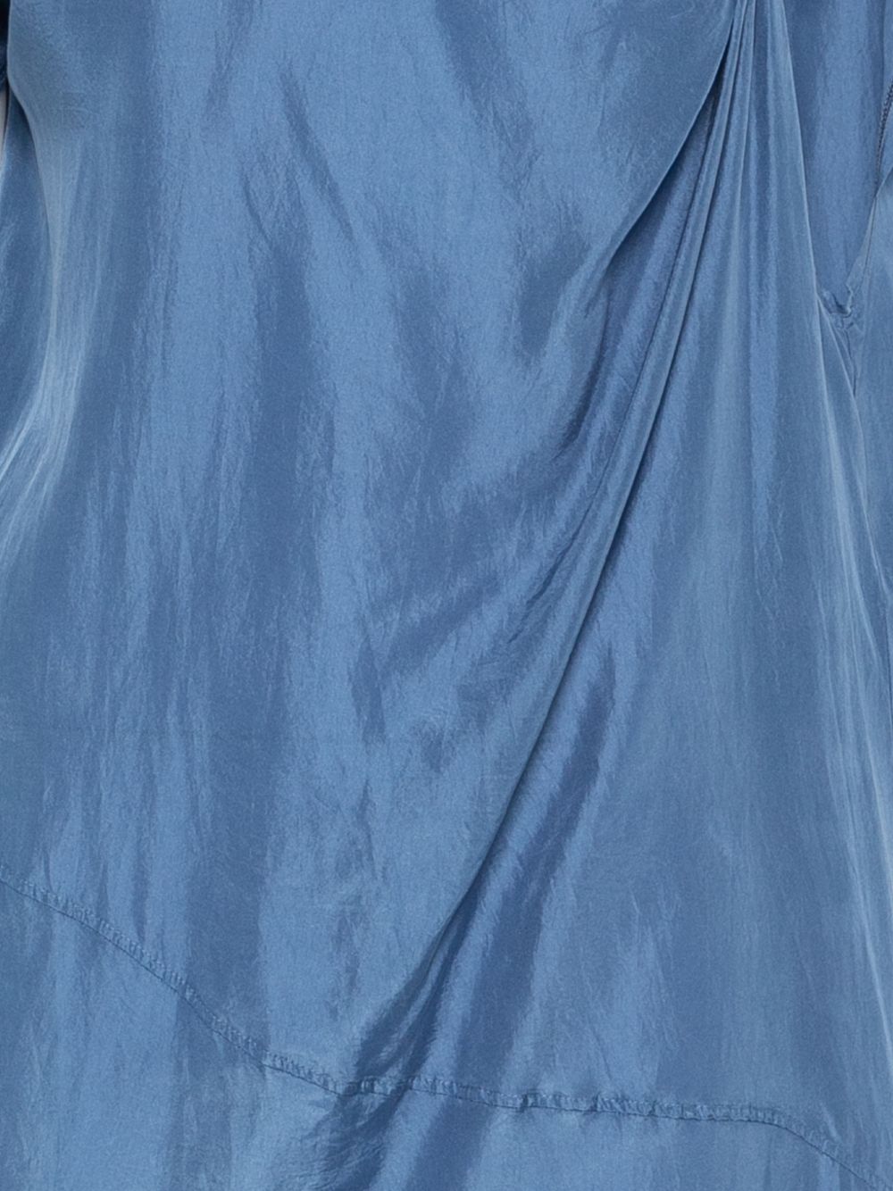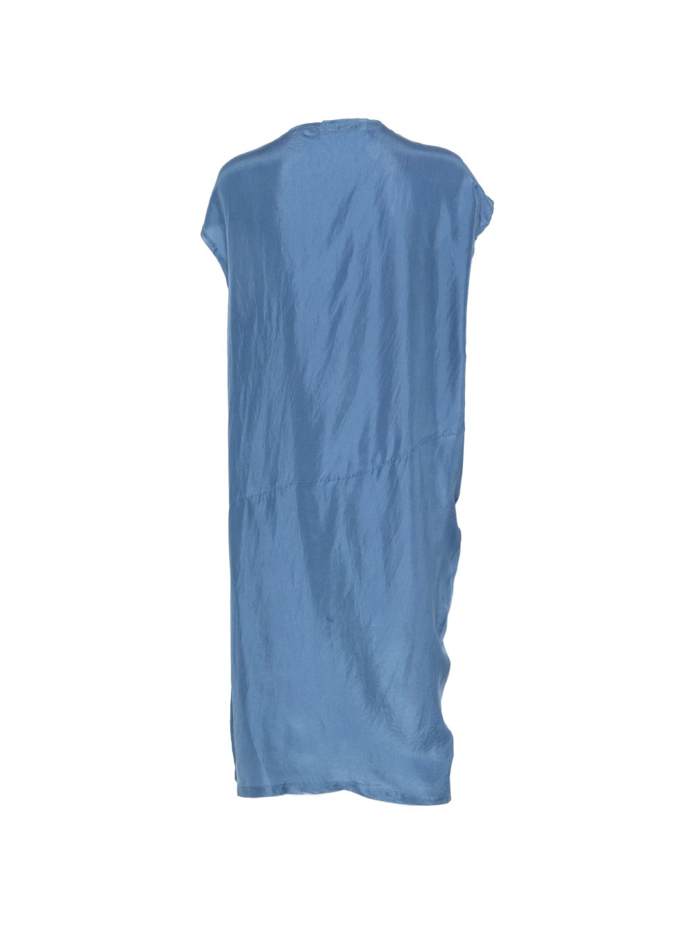 Abito in seta habotai azzurro, taglio midi, taglio asimmetrico, nodo sulla spalla, giro maniche