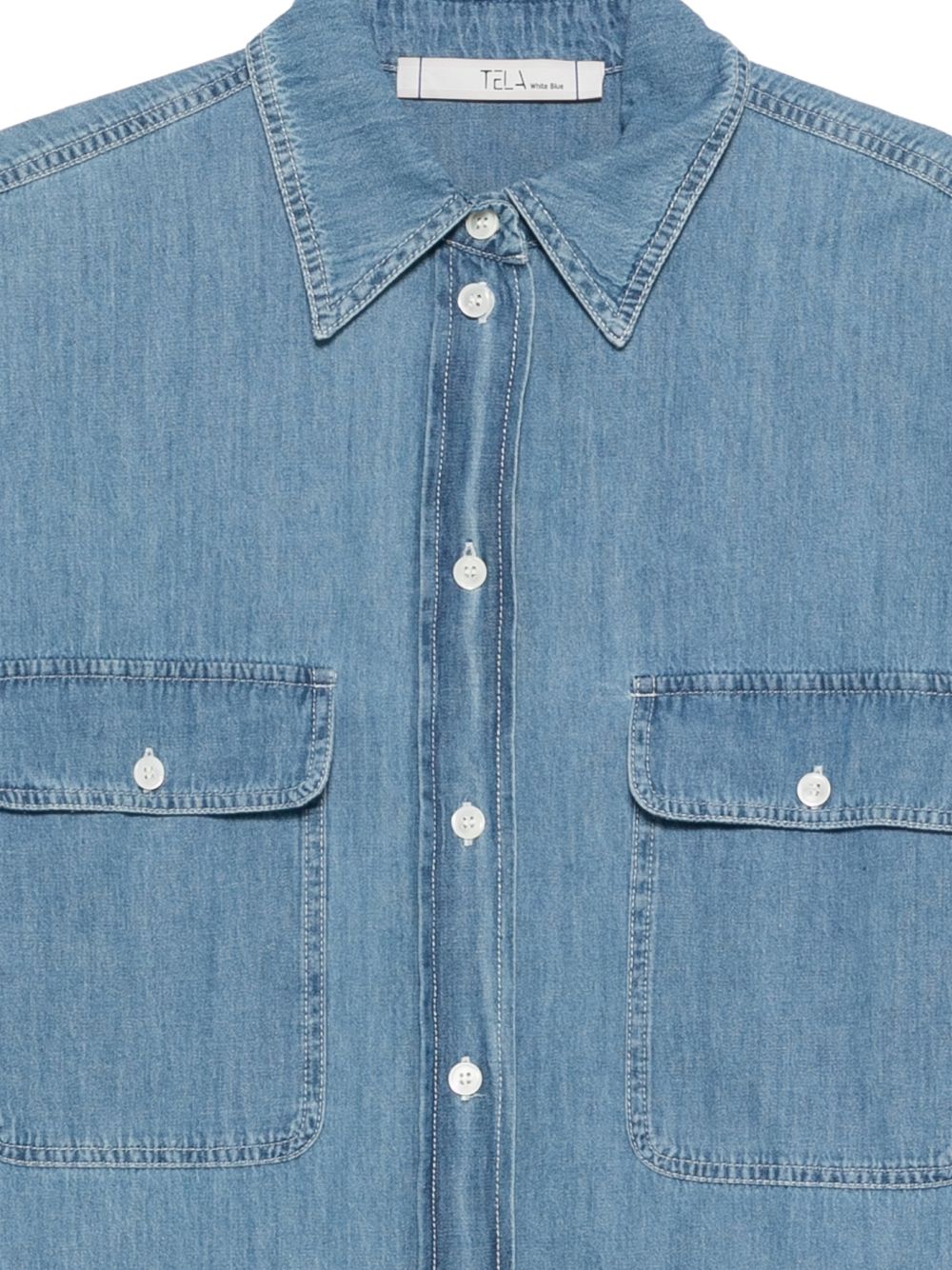 Camicia in denim blu, manica scesa, chiusura con bottoni, collo classico