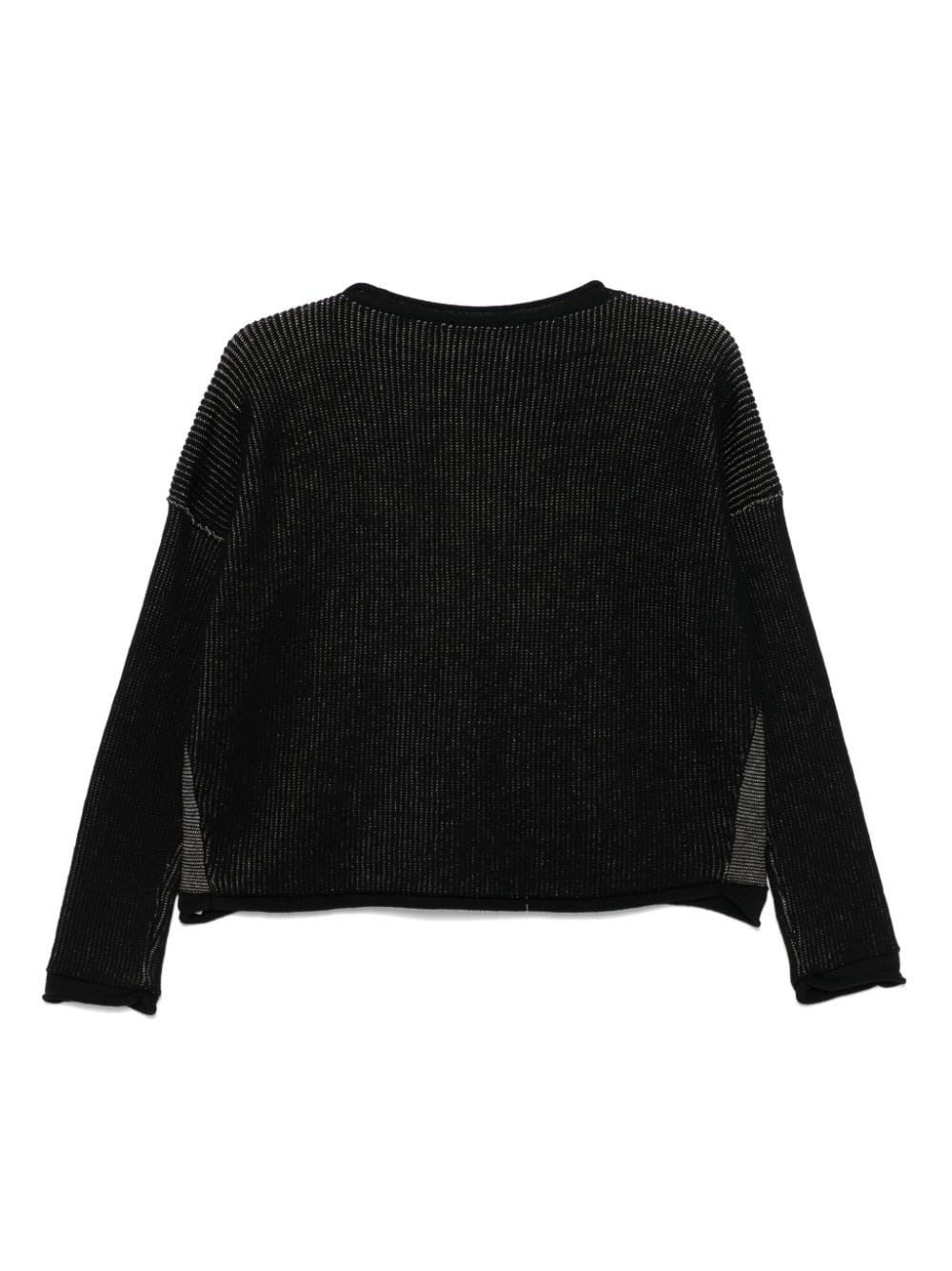 Maglia nero in misto lana e lino con lavorazione a contrasto, scollo rotondo, maniche lunghe, spalla scesa e orlo arrotolato.