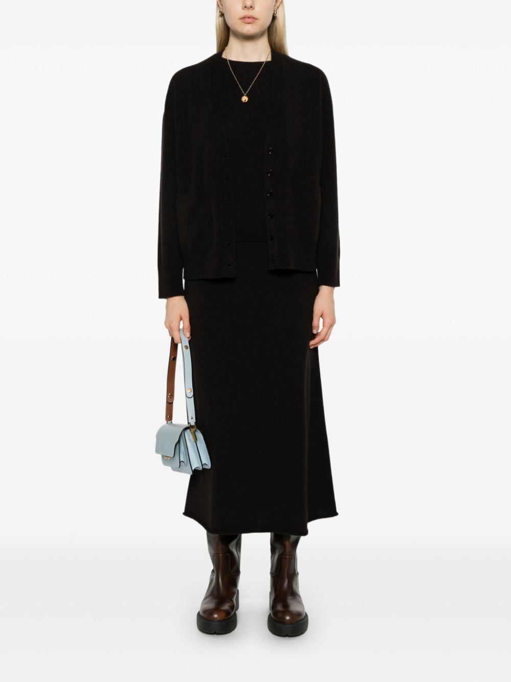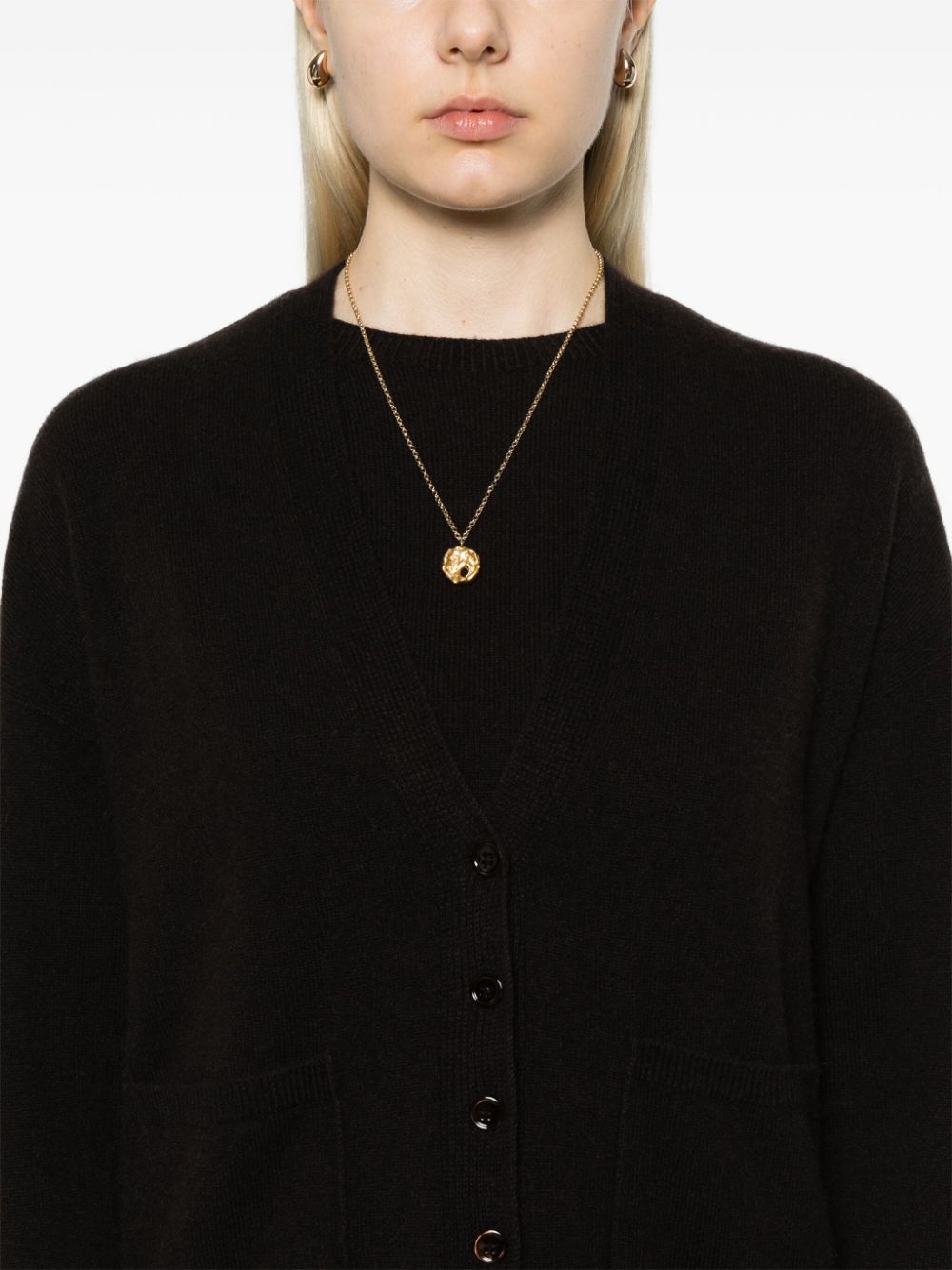 Costruzione in maglia, chiusura frontale con bottoni, scollo a V, scollo a goccia, maniche lunghe, due tasche laterali applicate. orlo dritto