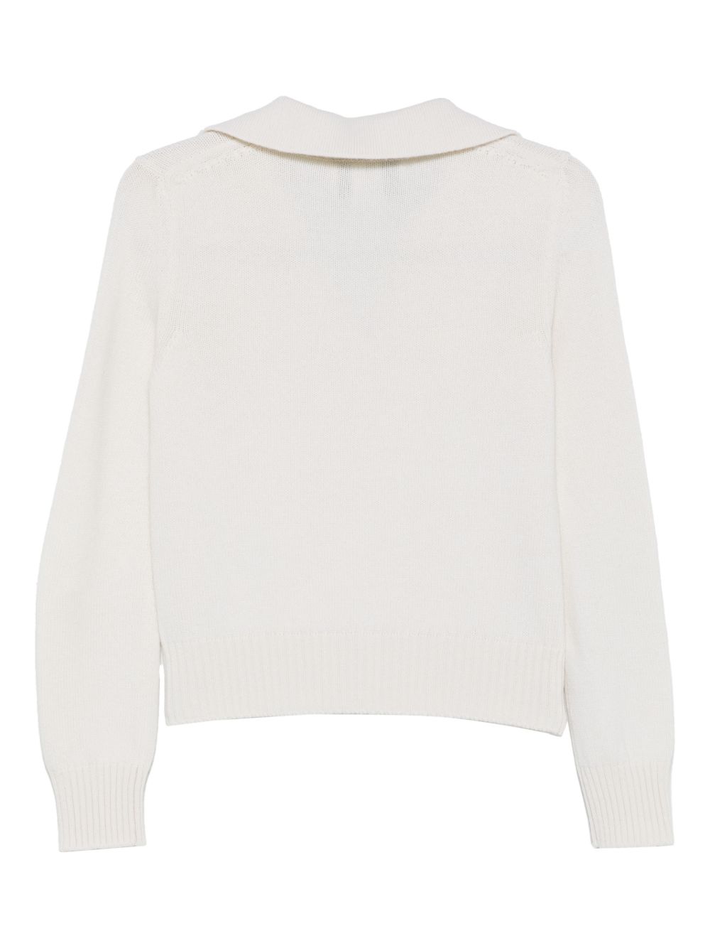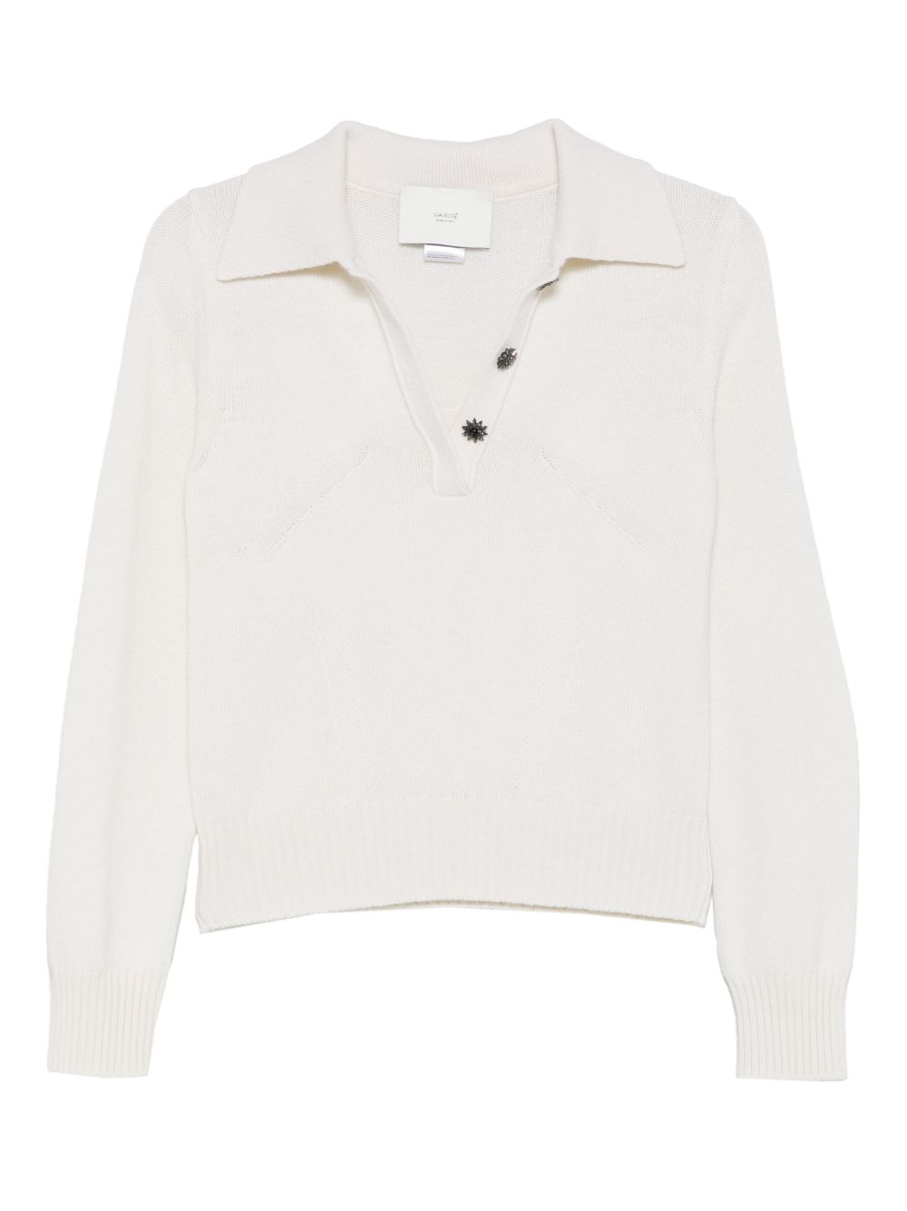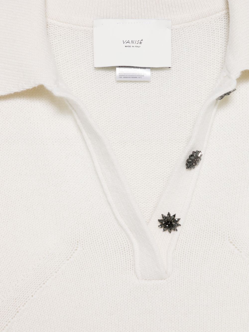 Polo in lana cashmere latte, abbottonatura frontale con bottoni fiori strass