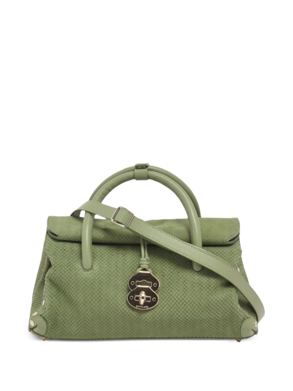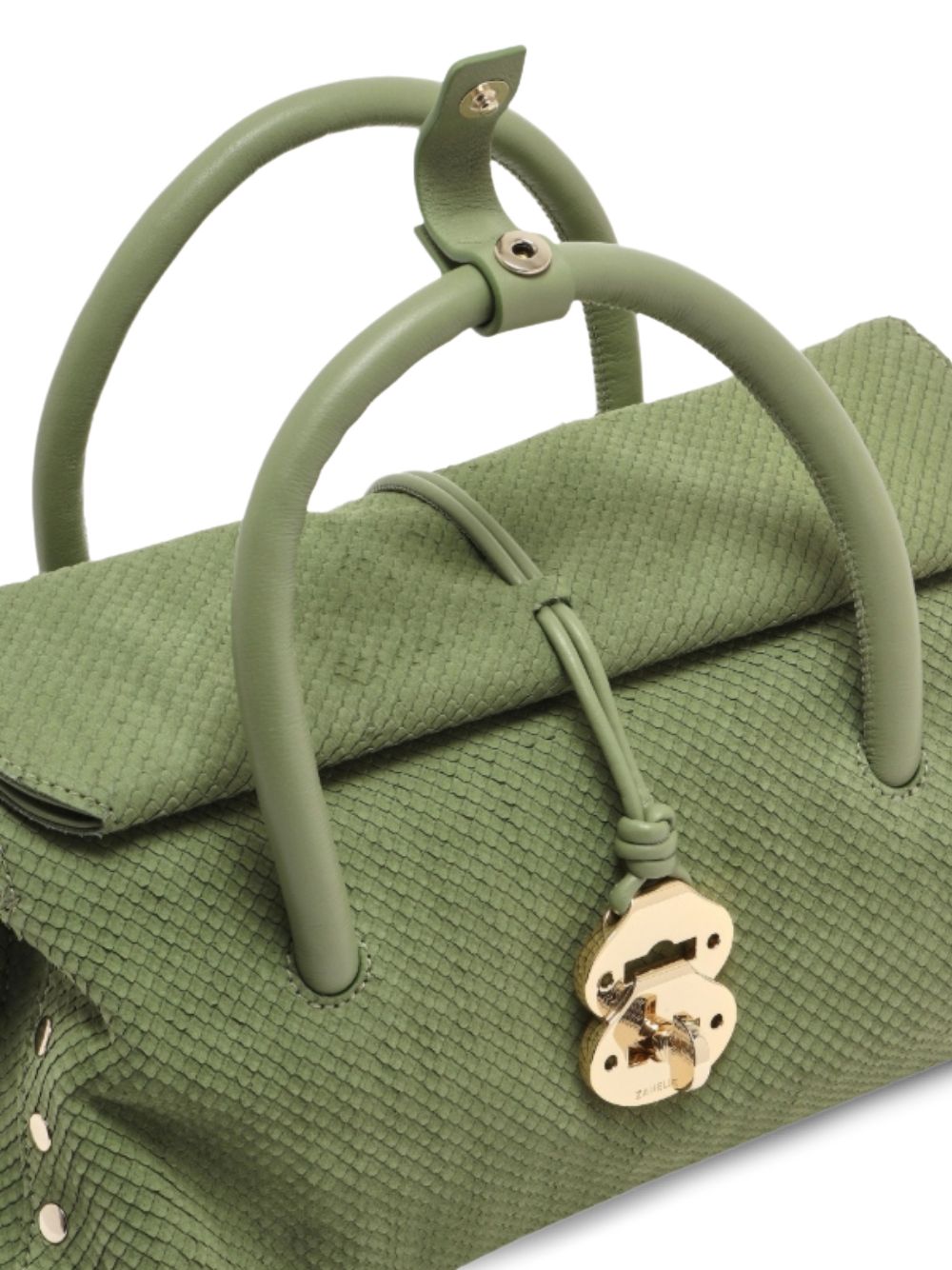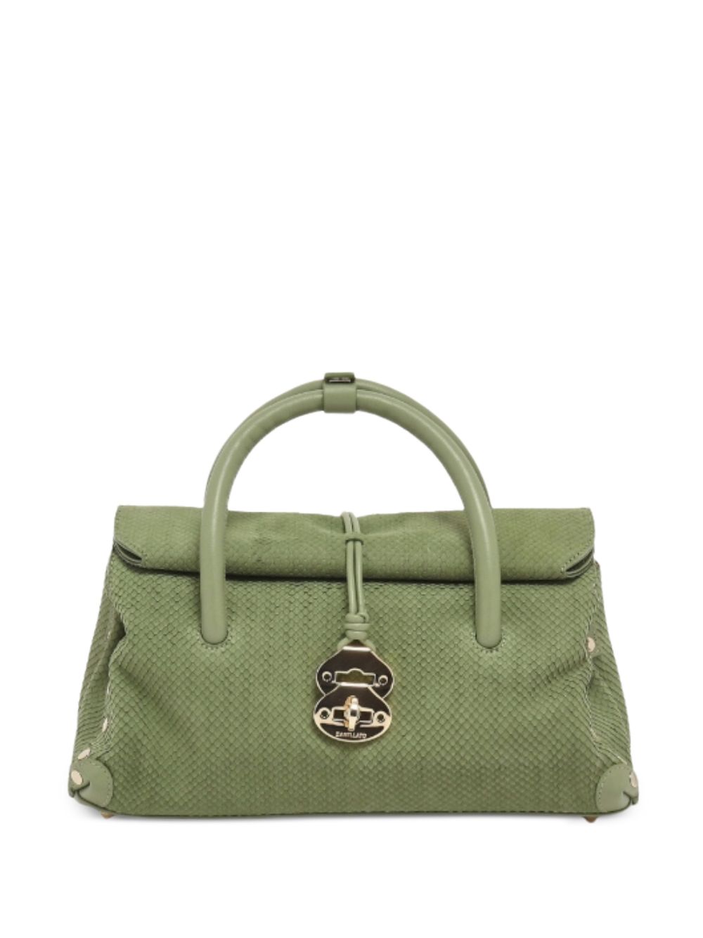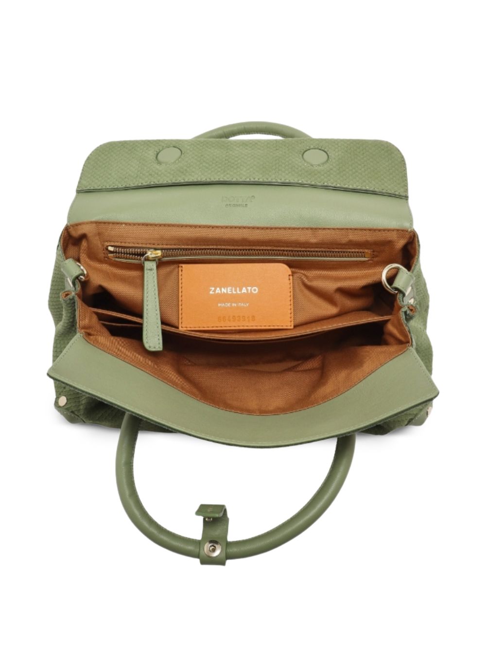 Borsa "Dotta amoretto baby" in pelle stampa rettile verdino, finiture color argento, logo Zanellato, scomparto divisorio interno, risvolto superiore, chiusura con girello, tracolla removibile